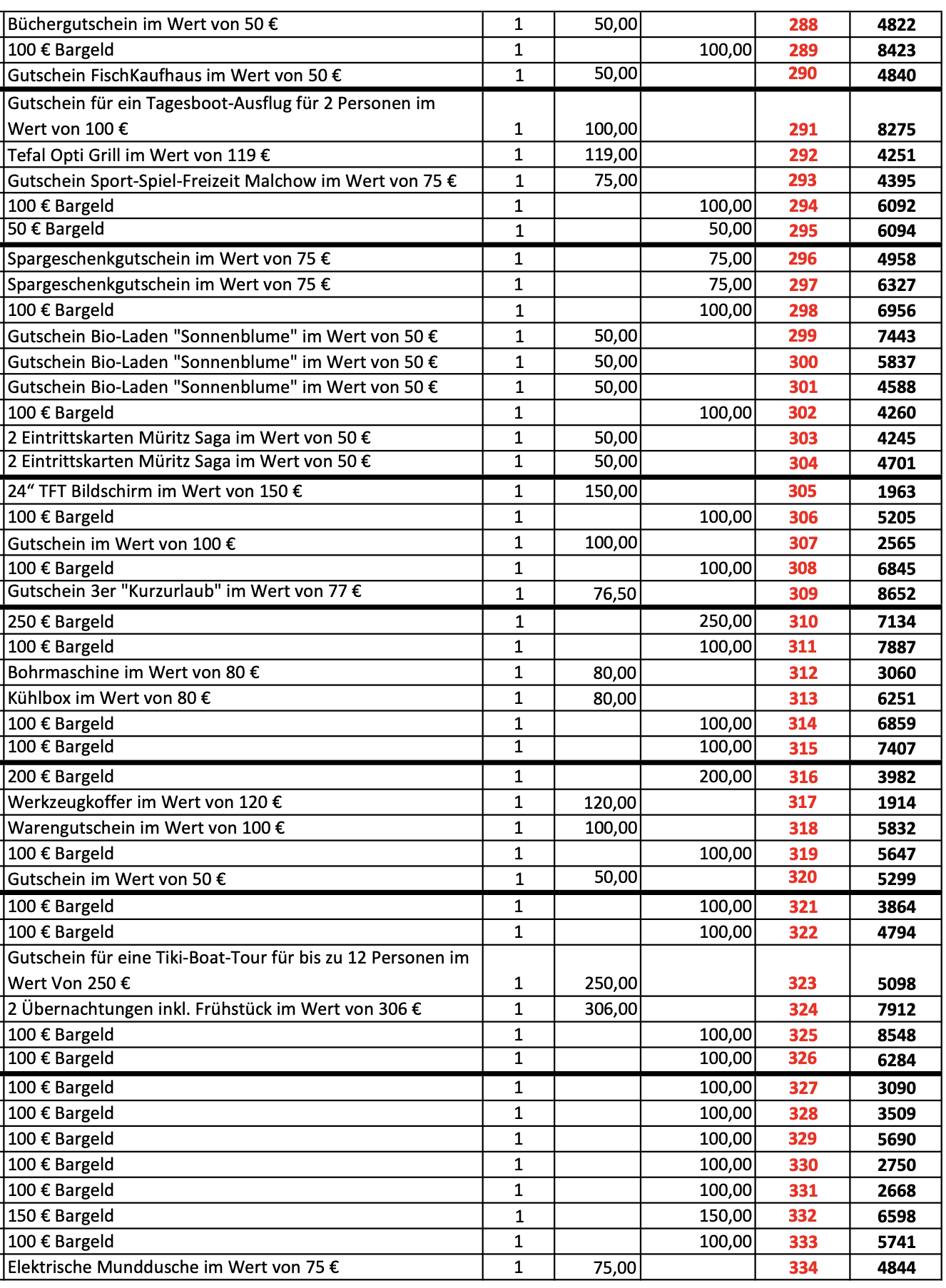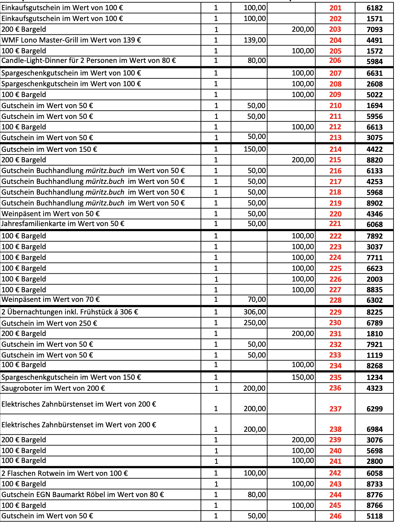 Die Weihnachtslotterie des Lions-Club Müritz und des Rotary-Club Waren ist Geschichte, aber die Gewinne sind noch nicht alle abgeholt. Auf vielfachen Leser-Wunsch veröffentlichen wir hier noch einmal alle Gewinnzahlen. Die beiden Clubs haben insgesamt 162 Gewinne im Gesamtwert von über 18 000 Euro verlost, der Erlös aus dem Verkauf der 8000 Kalender geht an verschiedene Kinder- und Jugendprojekte an der Müritz.
