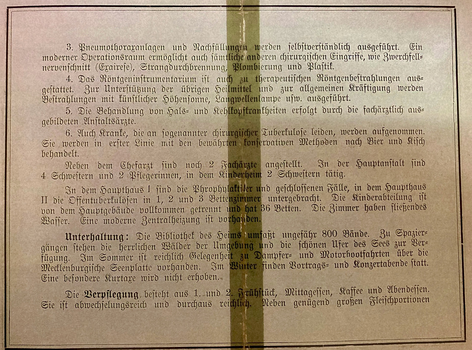 Aufnahmebedingungen: Zur Behandlung eignen sich sämtliche Lungen-, Hals- und Kehlkopfkranke ferner solche, die an sog. chirurg. Tuberkulose leiden. Auch Prophylaktiker werden aufgenommen. Männliche Jugendliche werden in der besonderen jugendlichen Abteilung nur bis zum 20. Lebensjahr aufgenommen, auf der Privatstation jedoch in jedem Alter. Jeder Kranke verpflichtet sich zur Anerkennung der Hausordnung.