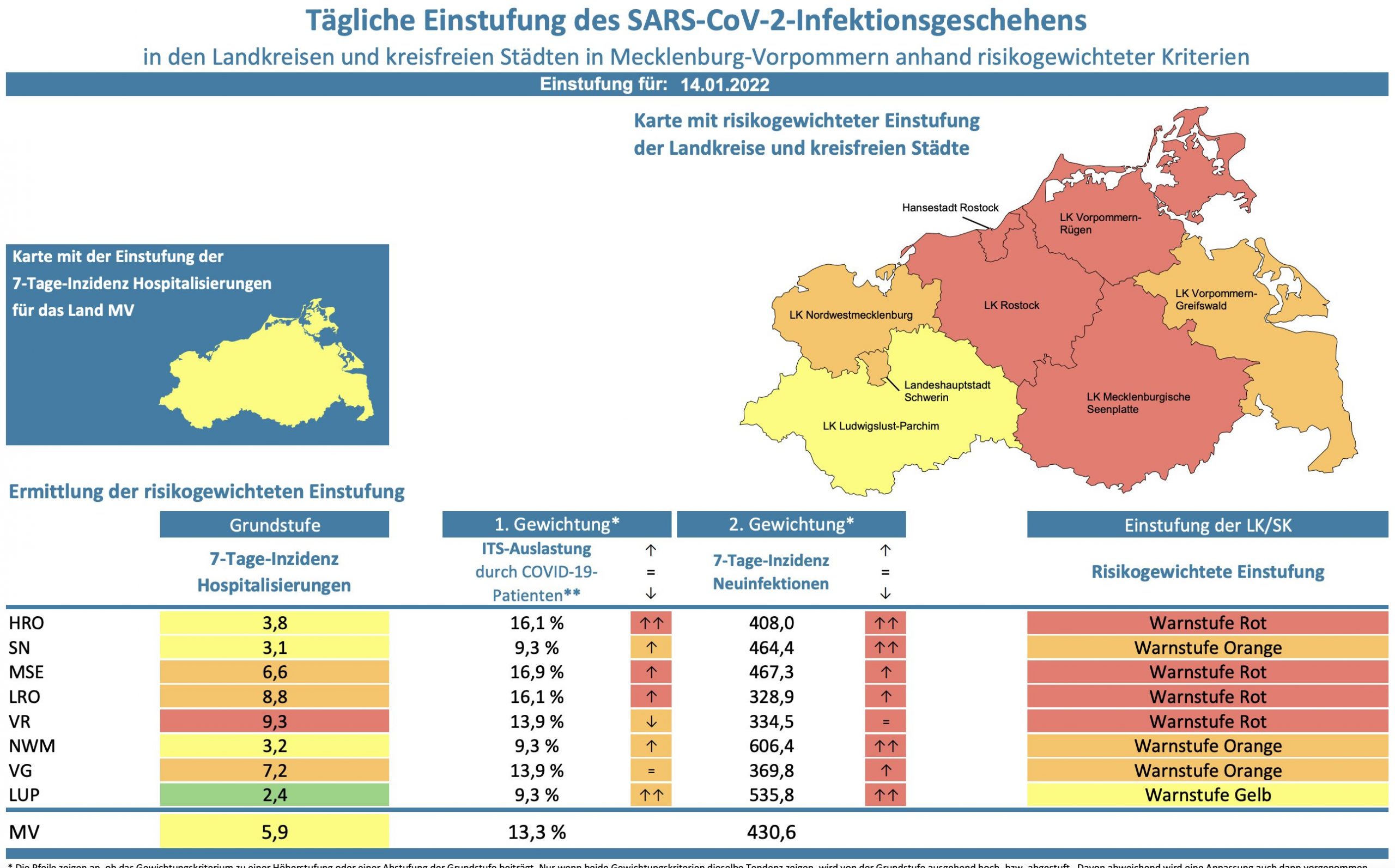 Die Hospitalisierung in ganz Mecklenburg-Vorpommern liegt heute bei 5,9, die Inzidenz des Landes steigt von 426,2 auf 430,6. Das Land Mecklenburg-Vorpommern meldet heute 1138 Neuinfektionen und 12 neue Todesfälle.