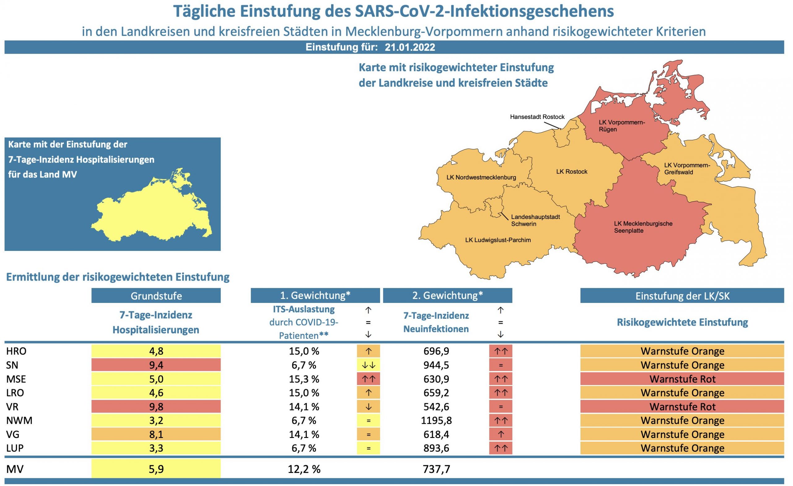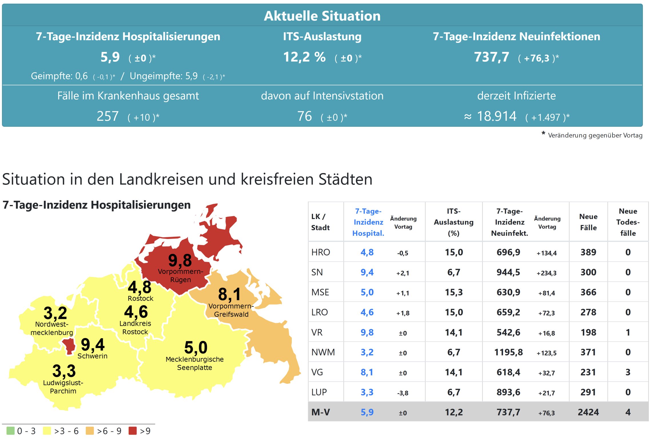 Die Hospitalisierung in ganz Mecklenburg-Vorpommern liegt heute bei 5,9, die Inzidenz des Landes steigt von 662,0 auf 737,7. Das Land Mecklenburg-Vorpommern meldet heute 2424 Neuinfektionen und vier neue Todesfälle.