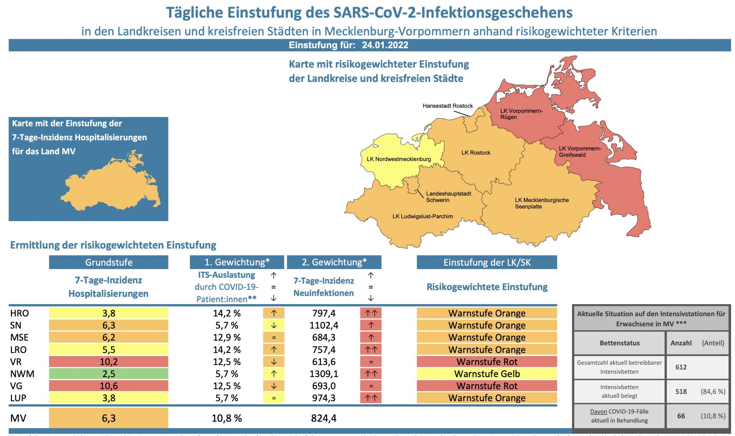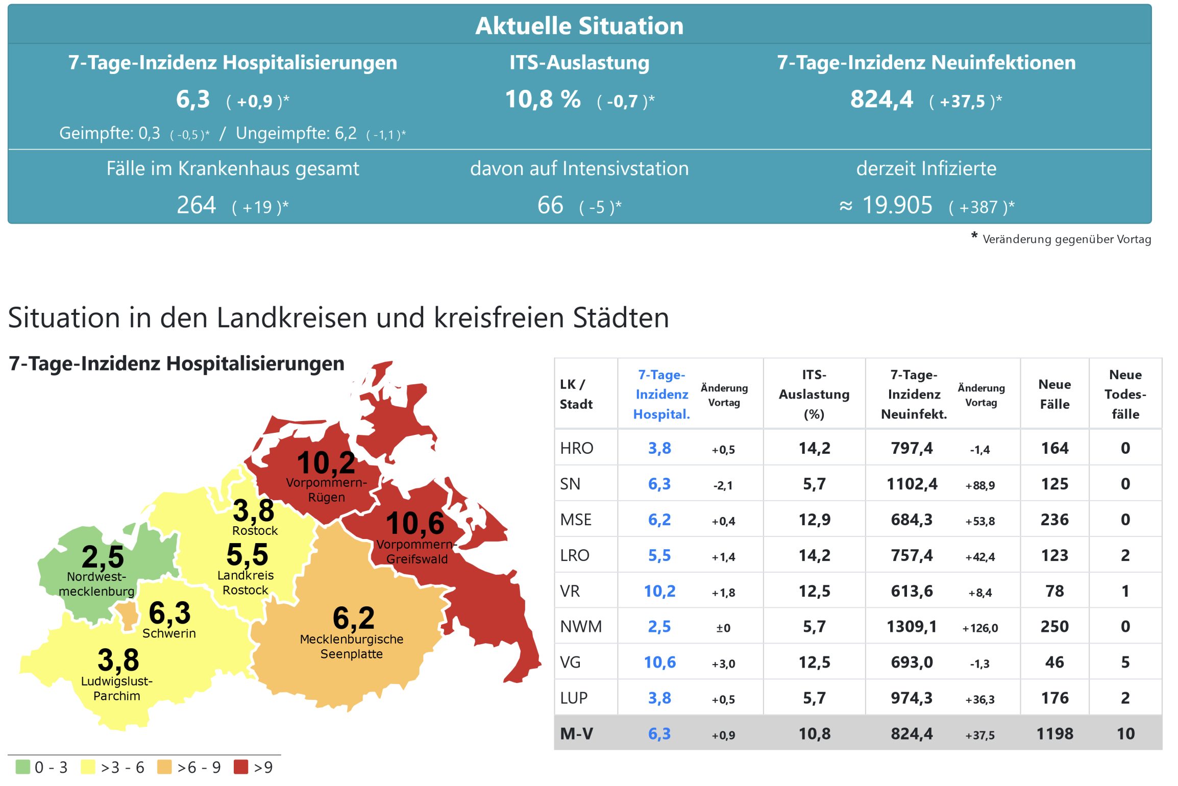 Die Hospitalisierung in ganz Mecklenburg-Vorpommern liegt heute bei 6,3, die Inzidenz des Landes steigt von 788,1 auf 824,4. Das Land Mecklenburg-Vorpommern meldet heute 1198 Neuinfektionen und zehn neue Todesfälle.