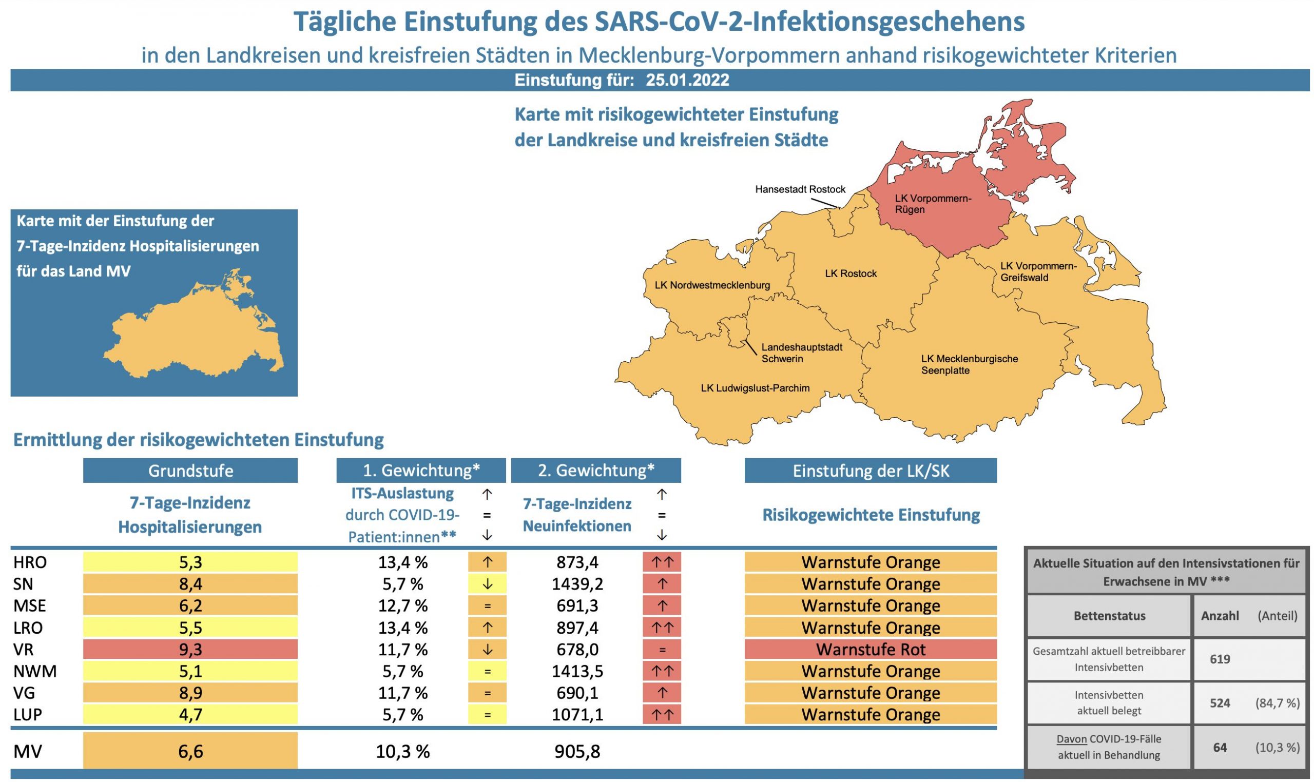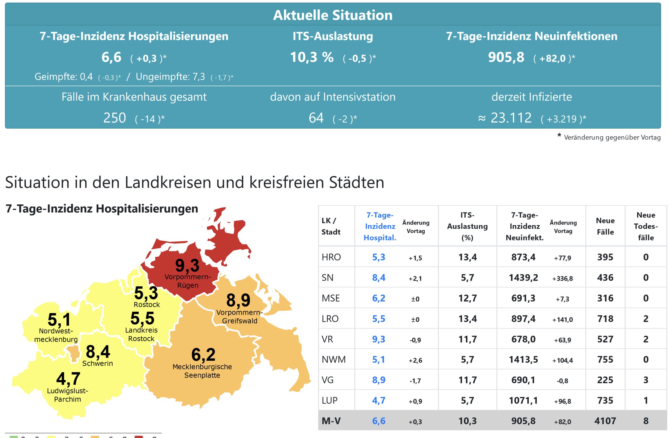 Die Hospitalisierung in ganz Mecklenburg-Vorpommern liegt heute bei 6,63, die Inzidenz des Landes steigt von 824,4 auf 905,8. Das Land Mecklenburg-Vorpommern meldet heute 4107 Neuinfektionen und acht neue Todesfälle.