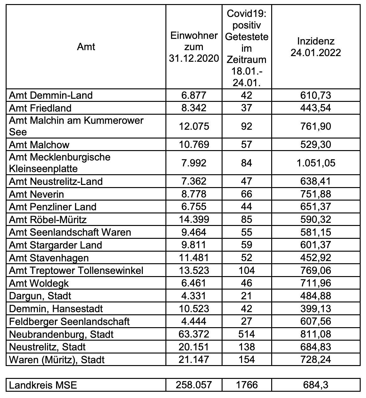 Im heutigen Beitrag finden Sie, liebe Leserinnen und Leser, auch wieder die Inzidenzwerte der Mecklenburgischen Seenplatte, aufgelistet nach Städten und Ämtern. Danach hat das Amt Mecklenburgische Kleinseenplatte eine Inzidenz von über 1000. In Waren liegt sie bei knapp 730.