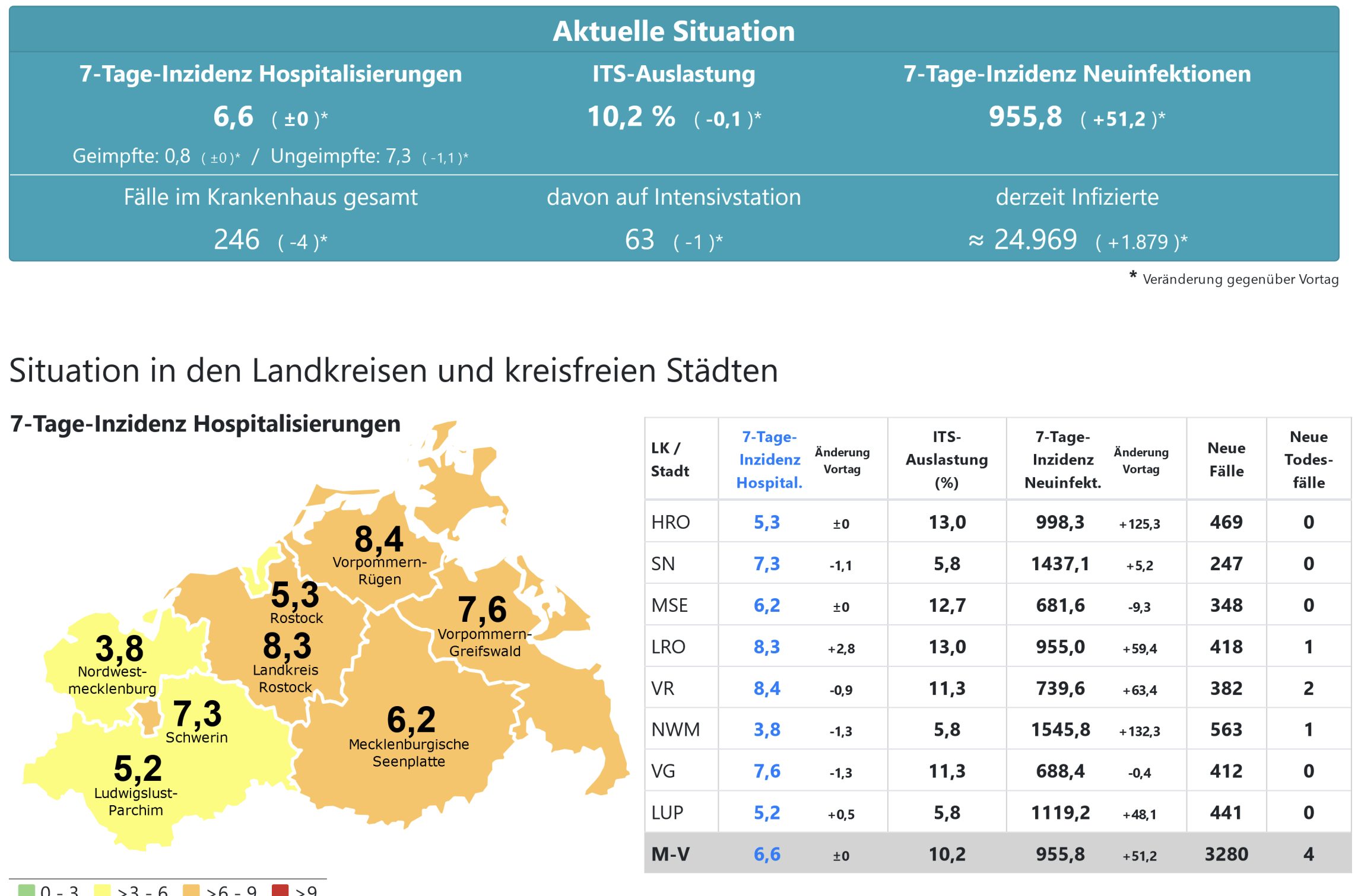 Die Hospitalisierung in ganz Mecklenburg-Vorpommern liegt heute unverändert bei 6,6, die Inzidenz des Landes steigt von 905,8 auf 955,8. Das Land Mecklenburg-Vorpommern meldet heute 3280 Neuinfektionen und vier neue Todesfälle.