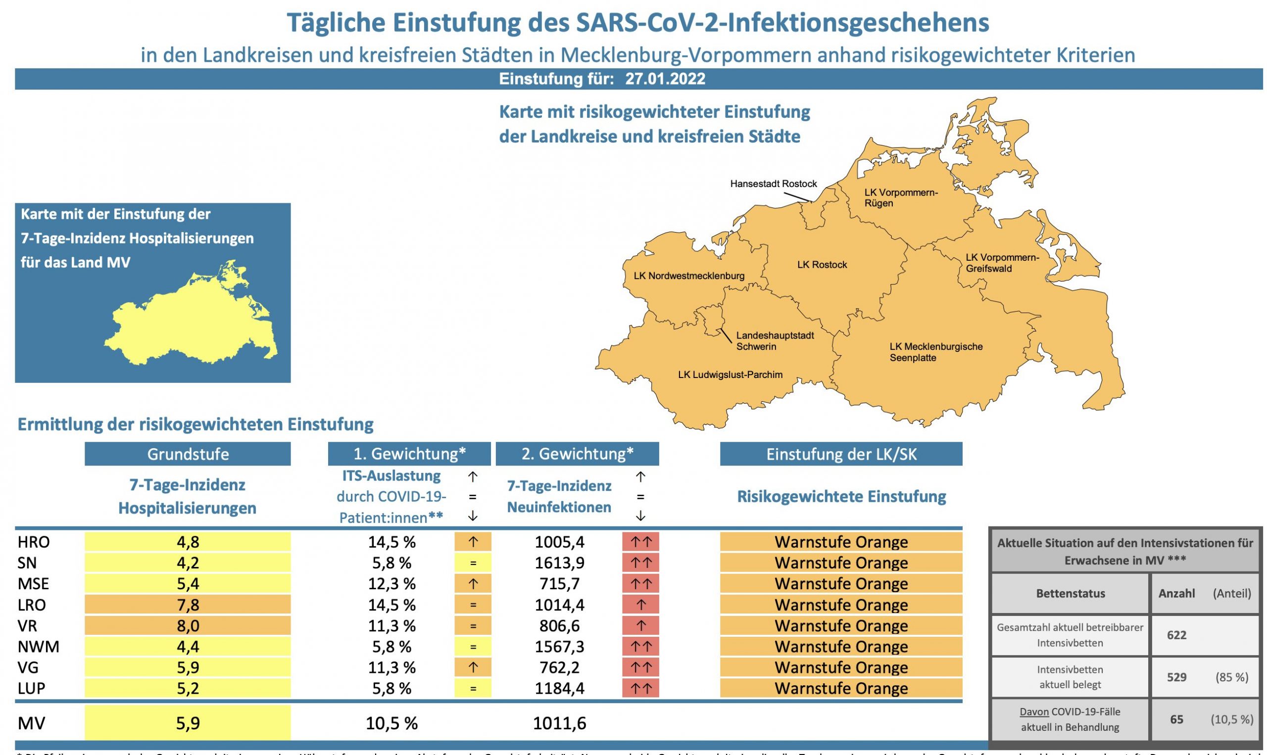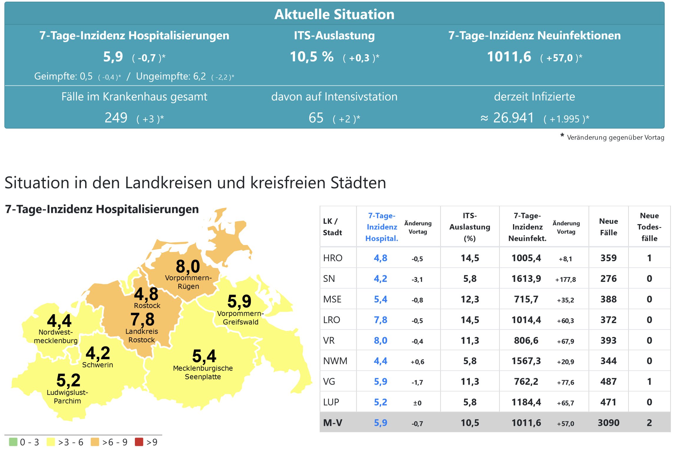 Die Hospitalisierung in ganz Mecklenburg-Vorpommern liegt heute bei 5,9, die Inzidenz des Landes steigt von 955,8 auf 1011,6. Das Land Mecklenburg-Vorpommern meldet heute 3090 Neuinfektionen und zwei neue Todesfälle.