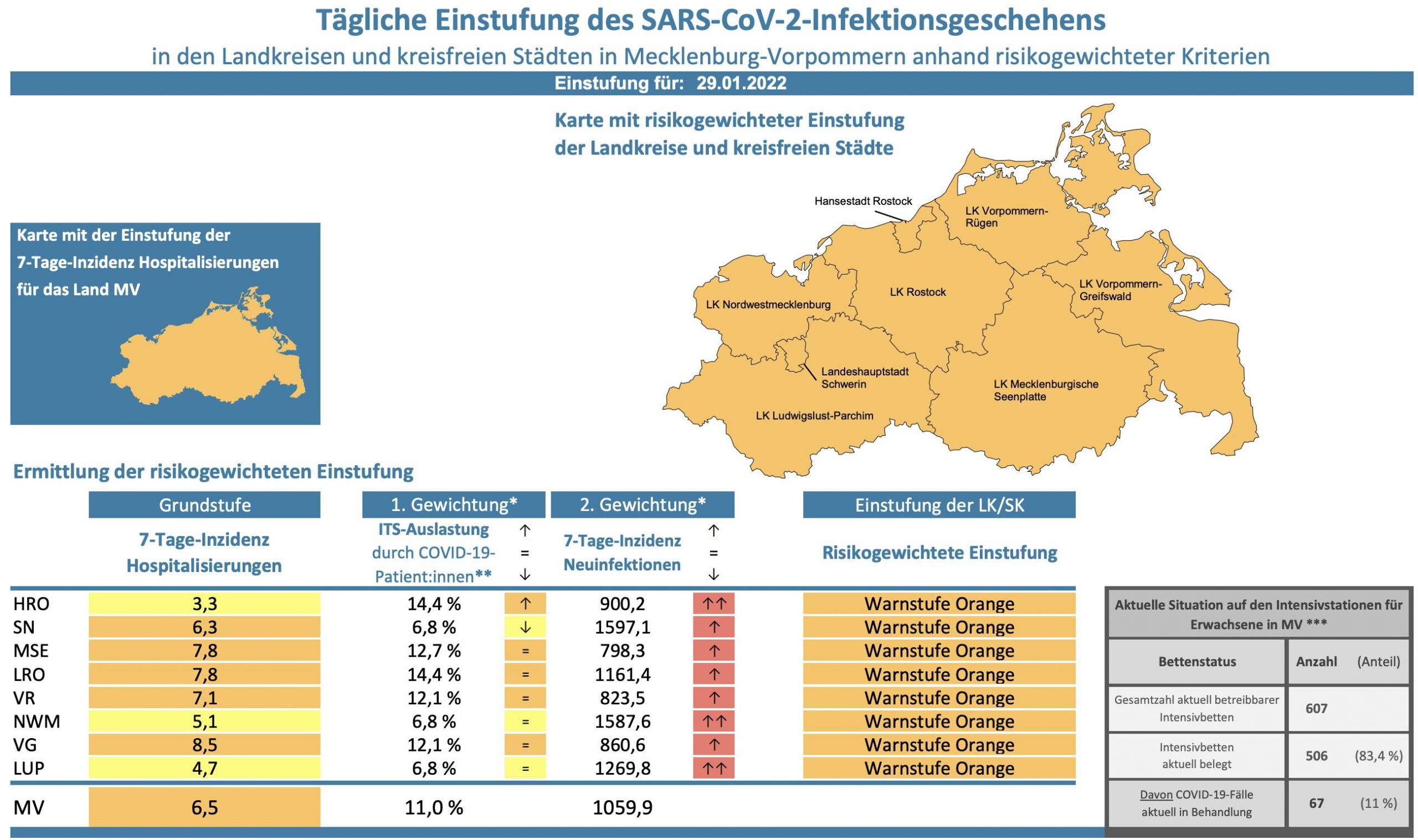 Die Hospitalisierung in ganz Mecklenburg-Vorpommern liegt heute bei 6,5, die Inzidenz des Landes steigt von 1042 auf 1059,9. Das Land Mecklenburg-Vorpommern meldet heute 2117 Neuinfektionen und keinen neuen Todesfall.