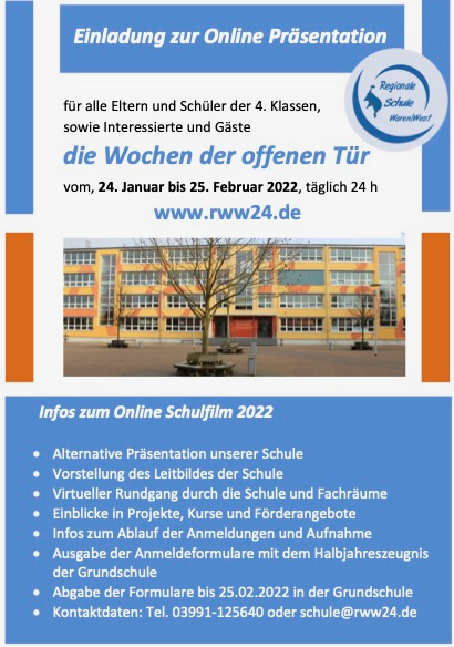 Wie überall – auch an den Schulen der Region sind derzeit keine größeren Veranstaltungen möglich. Und so fällt auch der „Tag der offenen Tür“ an der Regionalen Schulen Waren-West aus. Doch Eltern und Schüler können sich trotzdem sehr gut informieren, wie es nach der vierten Klasse bei den Mädchen und Jungen weiter geht. Auf der Homepage der Schule www.rww24.de gibt es eine umfassende Präsentation der Schule. Mit allgemeiner Vorstellung, virtuellem Rundgang, Einblick in die Projekte sowie vielen weiteren Infos.