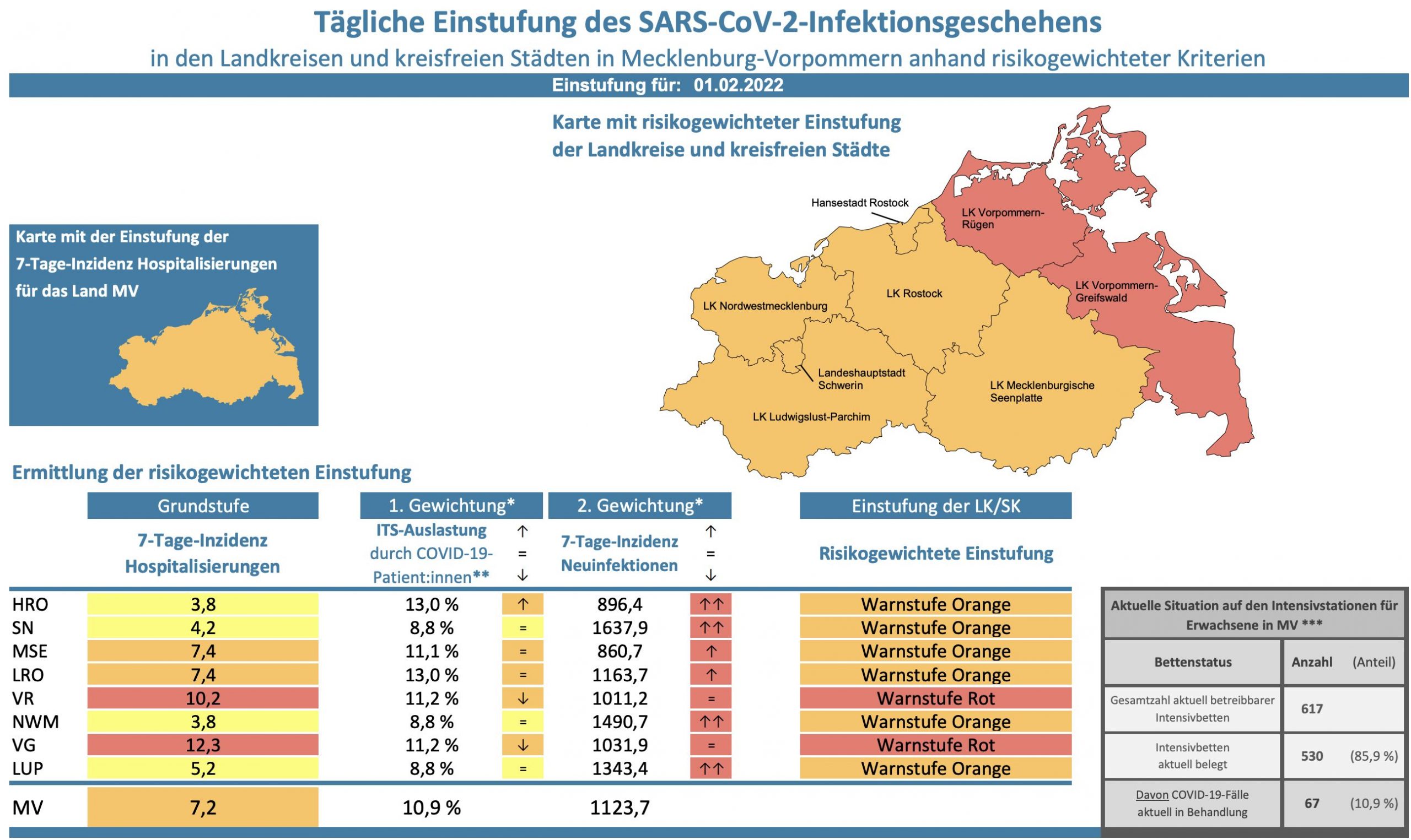 Die Hospitalisierung in ganz Mecklenburg-Vorpommern liegt heute bei 7,2, die Inzidenz des Landes steigt von 1119,7 auf 1123,7. Das Land Mecklenburg-Vorpommern meldet heute 4223 Neuinfektionen und 6 neue Todesfälle.