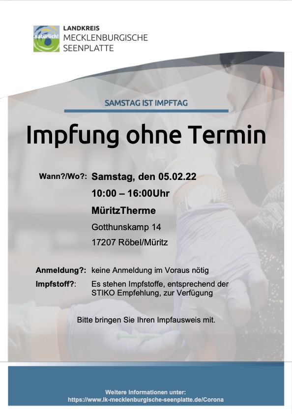 Am morgigen Sonnabend, 5. Februar, gibt es einen Sonder-Impftermin in der MüritzTherme in Röbel. Von 10 bis 16 Uhr wird ohne Anmeldung geimpft. Einen Kinder-Impftermin kündigt der Landkreis für den morgigen Sonnabend im Impfzentrum am Neuen Markt in Waren von 10 bis 18 Uhr an.
