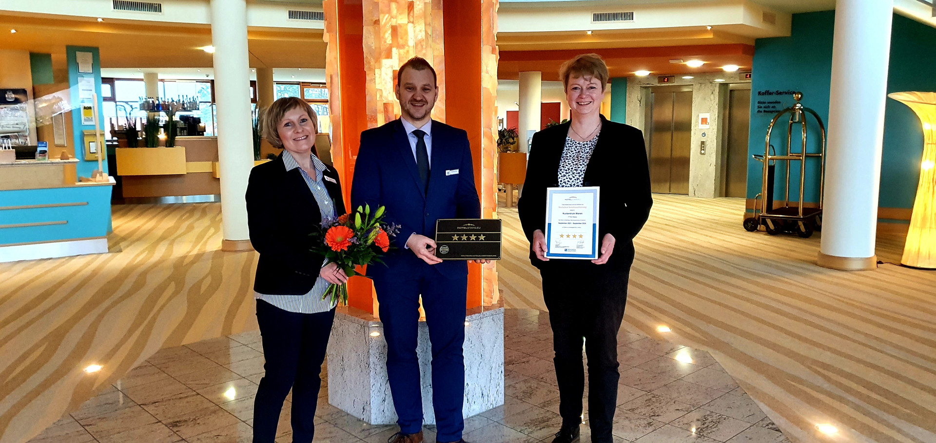 Foto: Die Hotelklassifizierung hat Birte Nagel (DEHOGA) in dieser Woche an Martina Schmidt, Direktionsassistentin (links) und Direktor Michael Elfert übergeben.