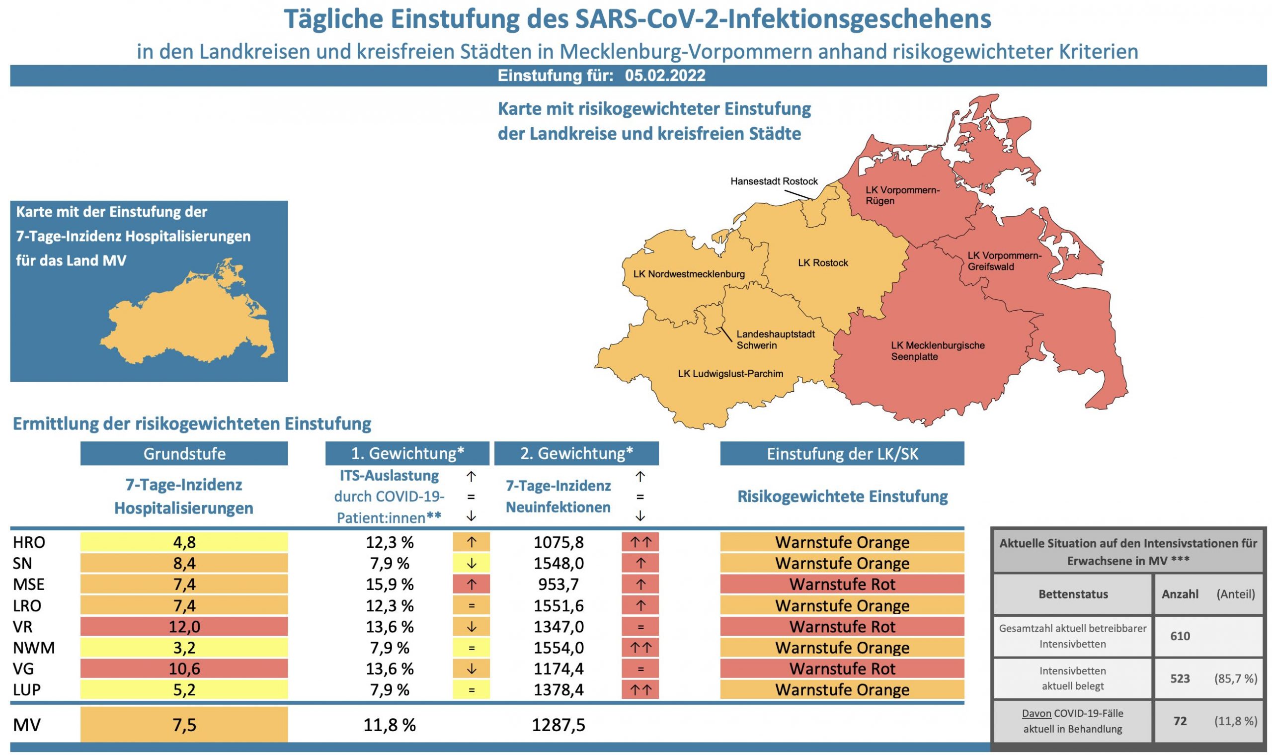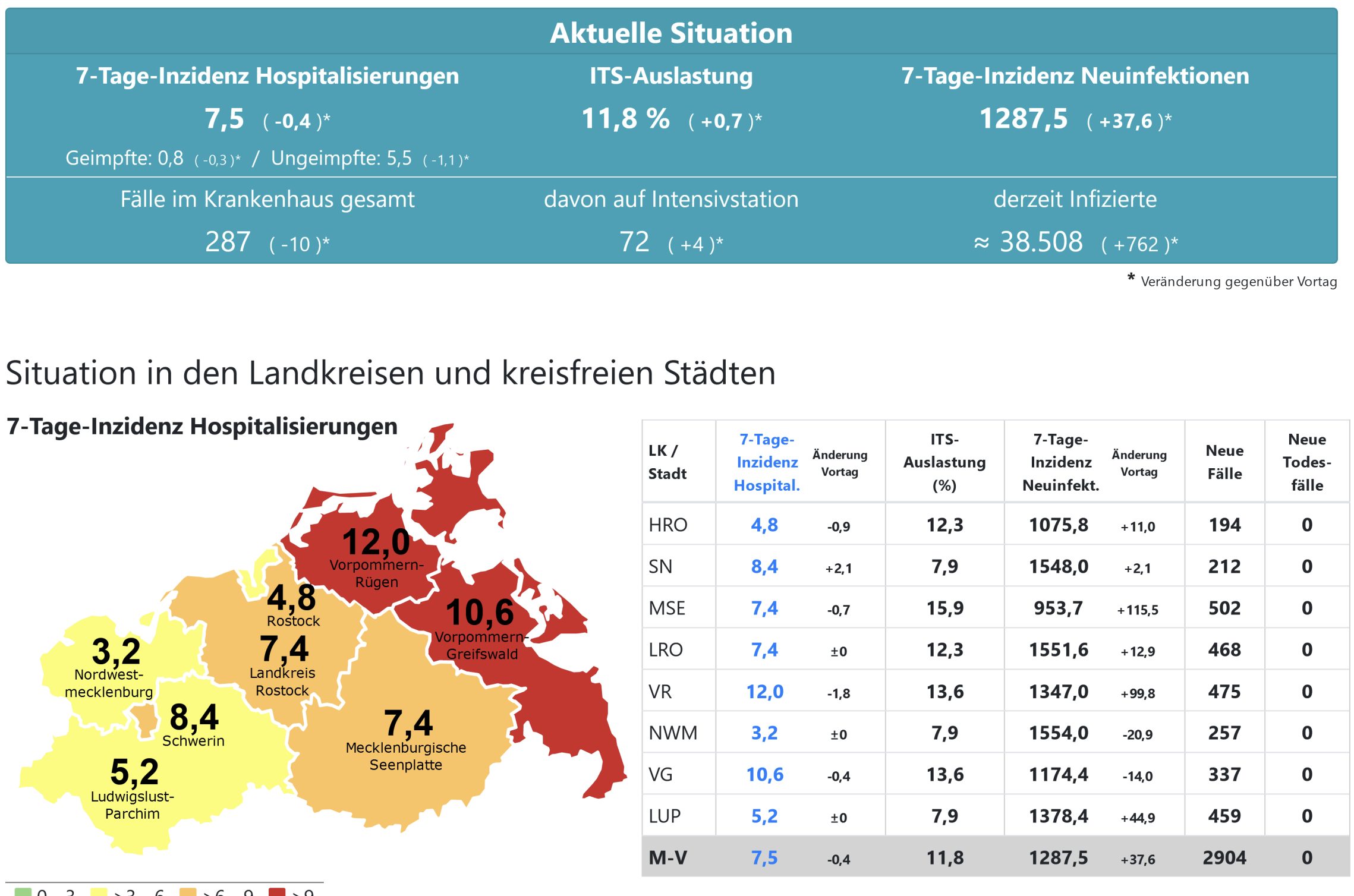 Die Hospitalisierung in ganz Mecklenburg-Vorpommern liegt heute bei 7,5, die Inzidenz des Landes steigt von 1250,1 auf 1287,5. Das Land Mecklenburg-Vorpommern meldet heute 2904 Neuinfektionen und keinen neuen Todesfall.