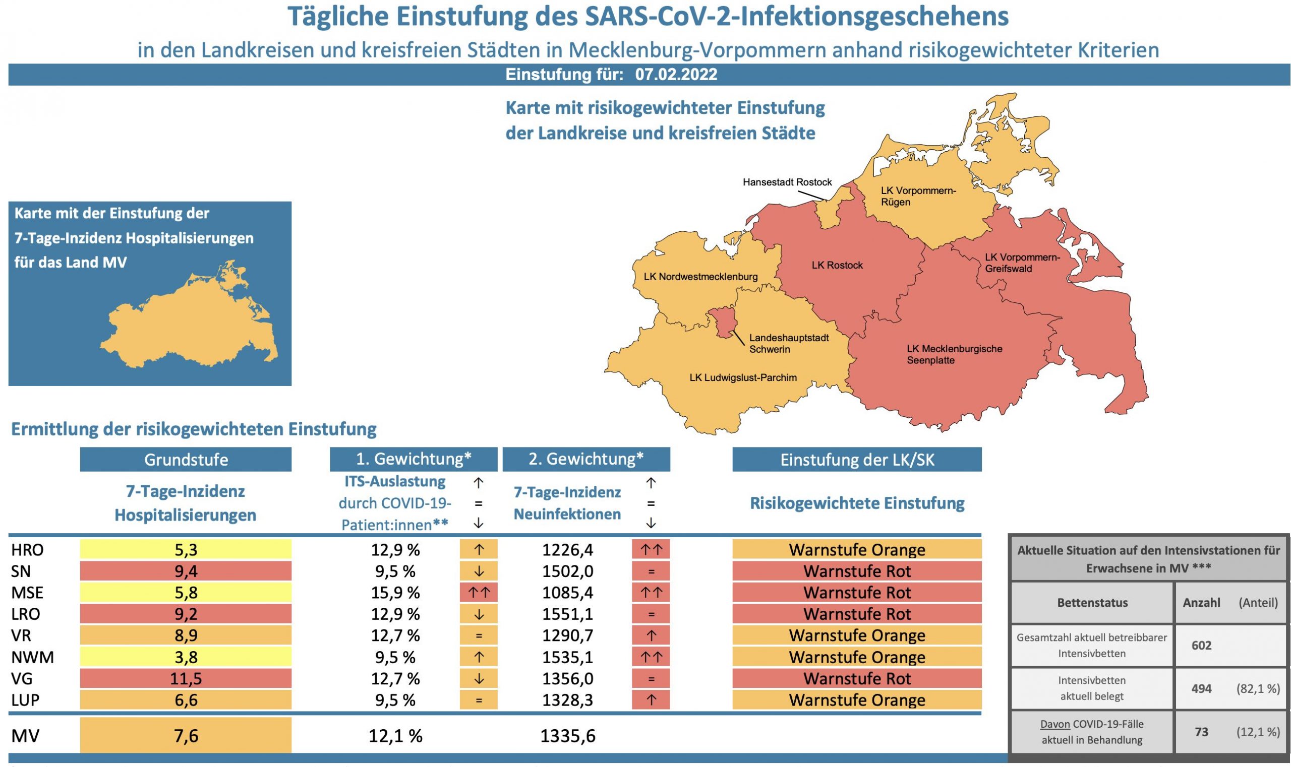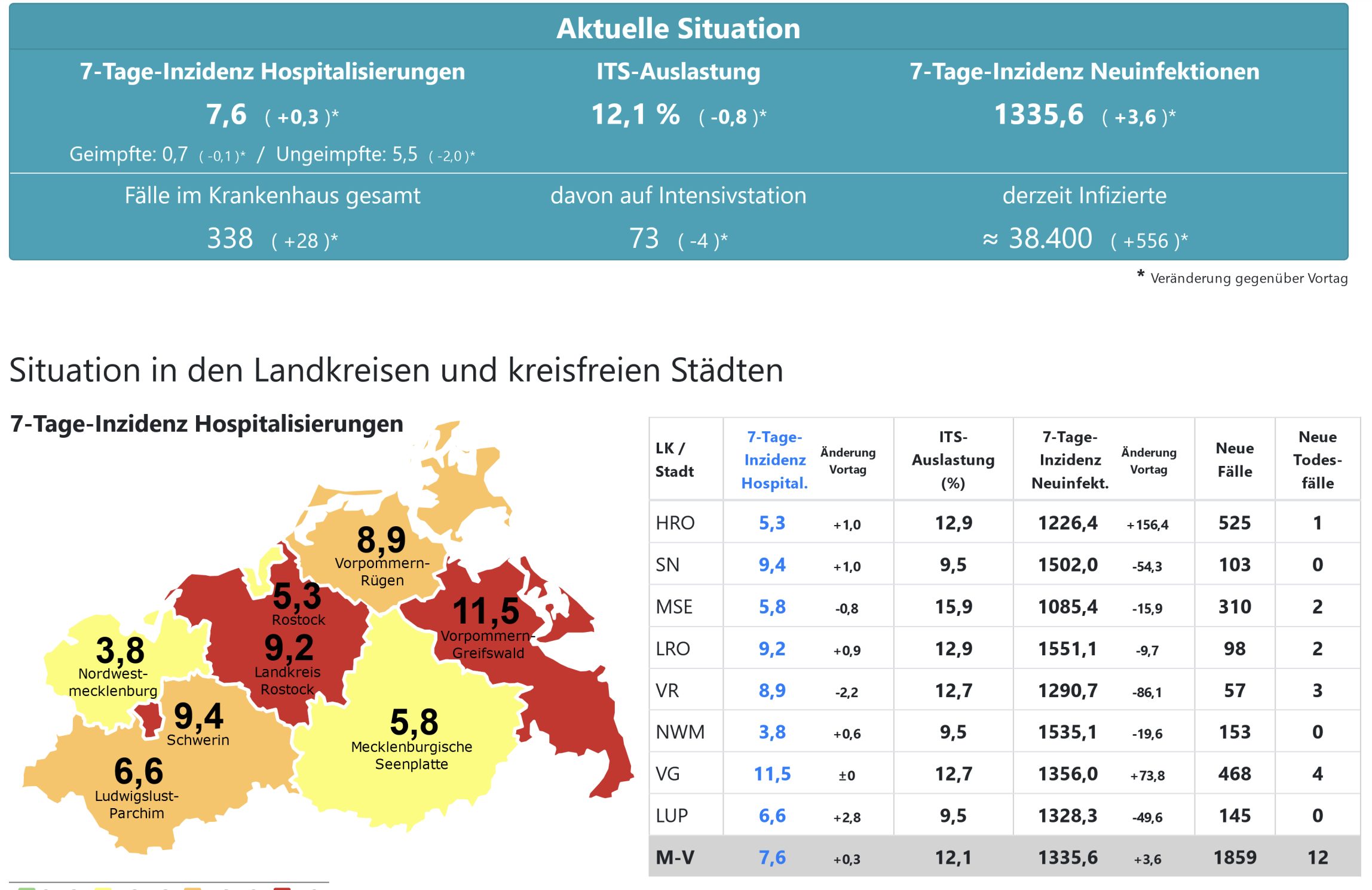 Die Hospitalisierung in ganz Mecklenburg-Vorpommern liegt heute bei 7,6, die Inzidenz des Landes steigt minimal 1335,6. Das Land Mecklenburg-Vorpommern meldet heute 1859 Neuinfektionen und zwölf neue Todesfälle.