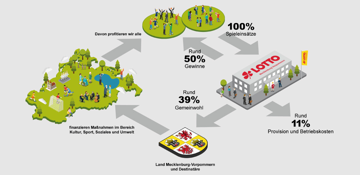 Was passiert eigentlich mit den vielen Millionen, die Lotto-Spieler jährlich in Mecklenburg-Vorpommern in der Hoffnung auf den großen Gewinn ausgeben? Von diesen Einnahmen werden rund 50 Prozent als Gewinne an die Spielteilnehmer ausgeschüttet. 39 Prozent kommen dem Gemeinwohl in Mecklenburg-Vorpommern zu Gute. 11 Prozent werden für Provisionen und Betriebskosten benötigt. Doch was genau verbirgt sich hinter den 39 Prozent für das Gemeinwohl?