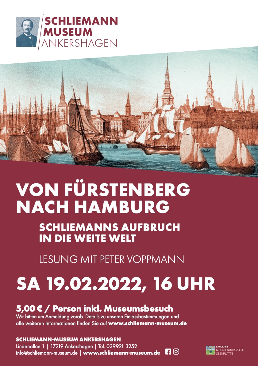 Das Heinrich-Schliemann-Museum ist wieder geöffnet und die ersten Veranstaltungen können wie geplant durchgeführt werden. Am 19. Februar steht um 16:00 Uhr im Veranstaltungssaal eine Lesung auf dem Programm. Peter Voppmann liest aus dem Buch „Von Fürstenberg nach Hamburg – Schliemanns Aufbruch in die weite Welt“. Der Eintritt kostet 5 Euro/Person inkl. Museumsbesuch.