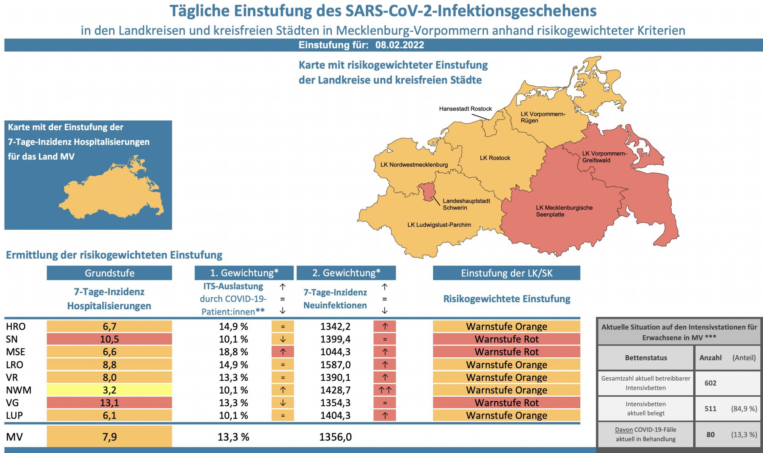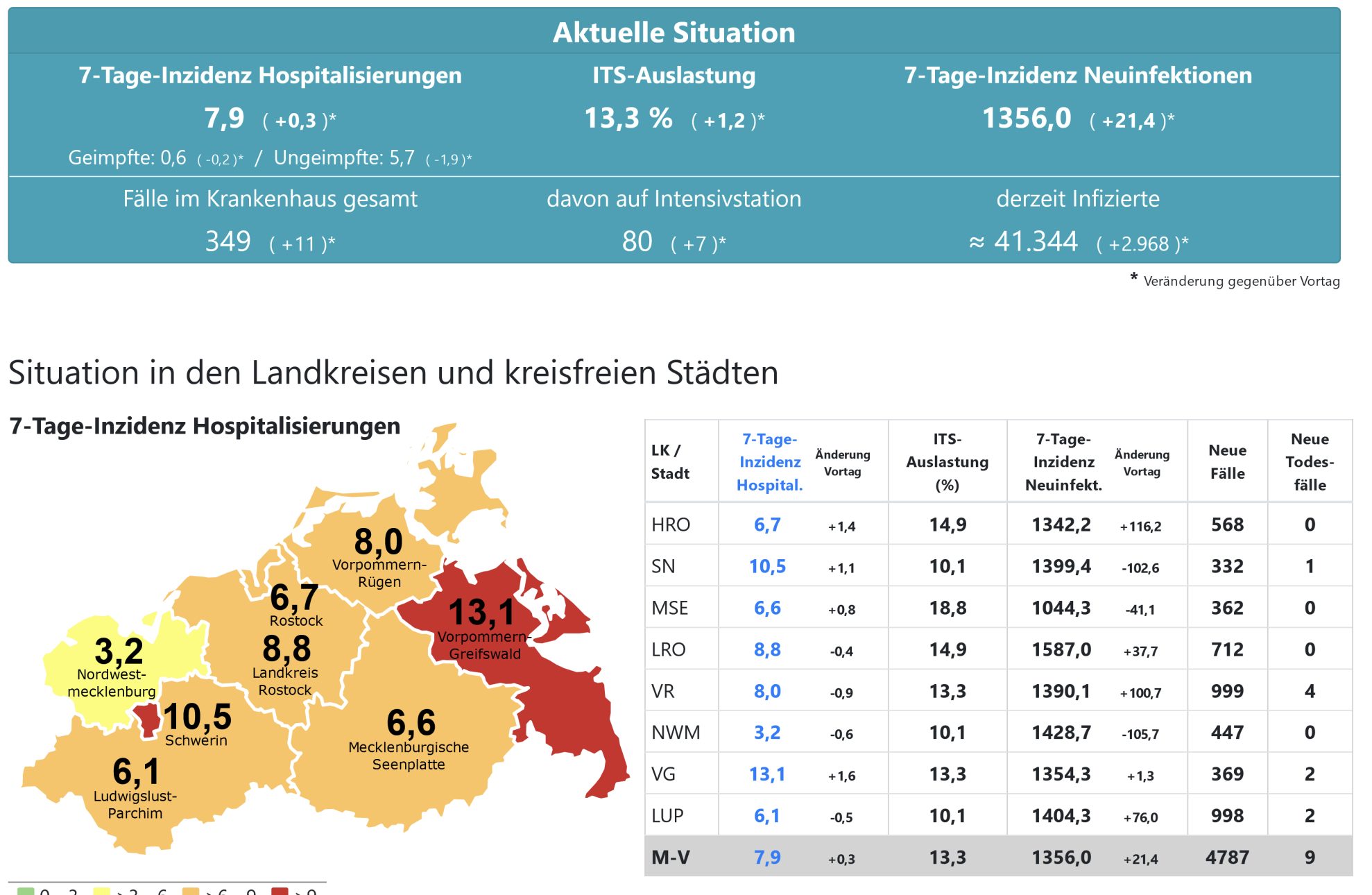 Die Hospitalisierung in ganz Mecklenburg-Vorpommern liegt heute bei 7,9, die Inzidenz des Landes steigt von 1335,6 auf 1356. Das Land Mecklenburg-Vorpommern meldet heute 4787 Neuinfektionen und neun neue Todesfälle.