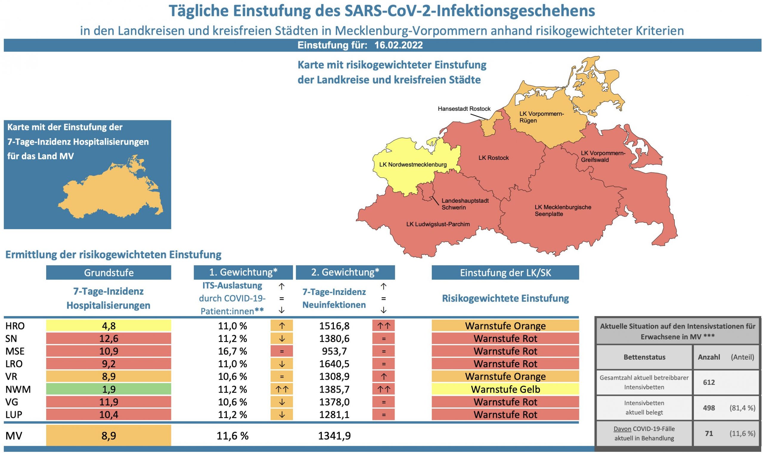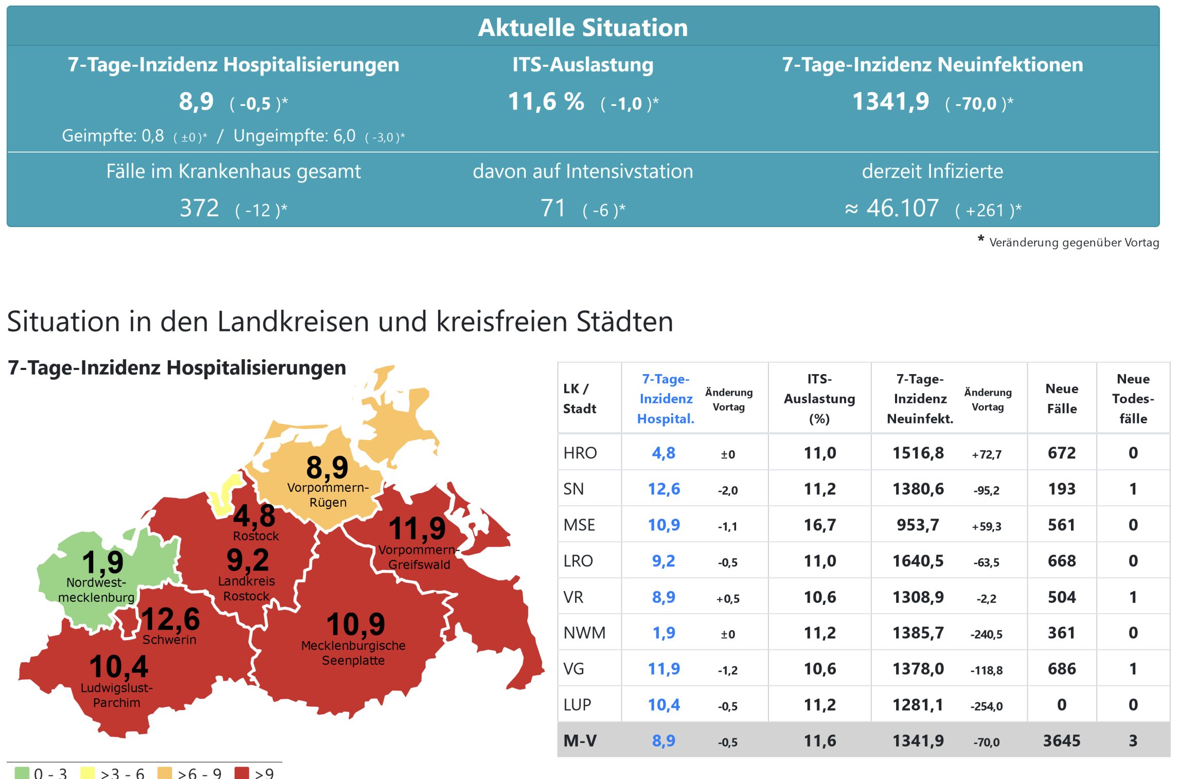 Die Hospitalisierung in ganz Mecklenburg-Vorpommern liegt heute bei 8,9, die Inzidenz des Landes sinkt von 1412,7 auf 1341,9. Das Land Mecklenburg-Vorpommern meldet heute 3645 Neuinfektionen drei neun neue Todesfälle.