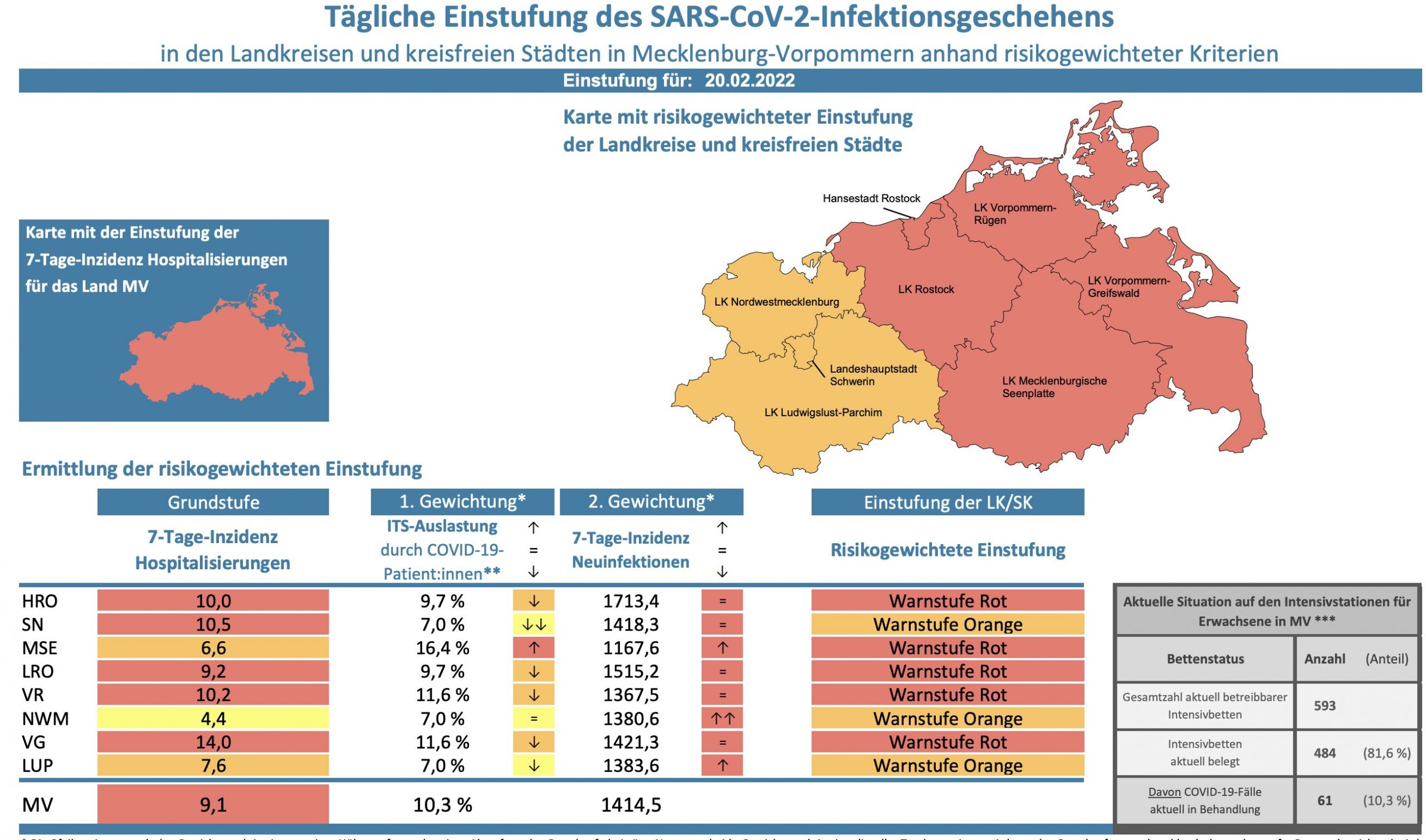 Die Hospitalisierung in ganz Mecklenburg-Vorpommern liegt heute bei 10,3, die Inzidenz des Landes sinkt auf 1414,5. Das Land Mecklenburg-Vorpommern meldet heute 922 Neuinfektionen einen neuen Todesfall.