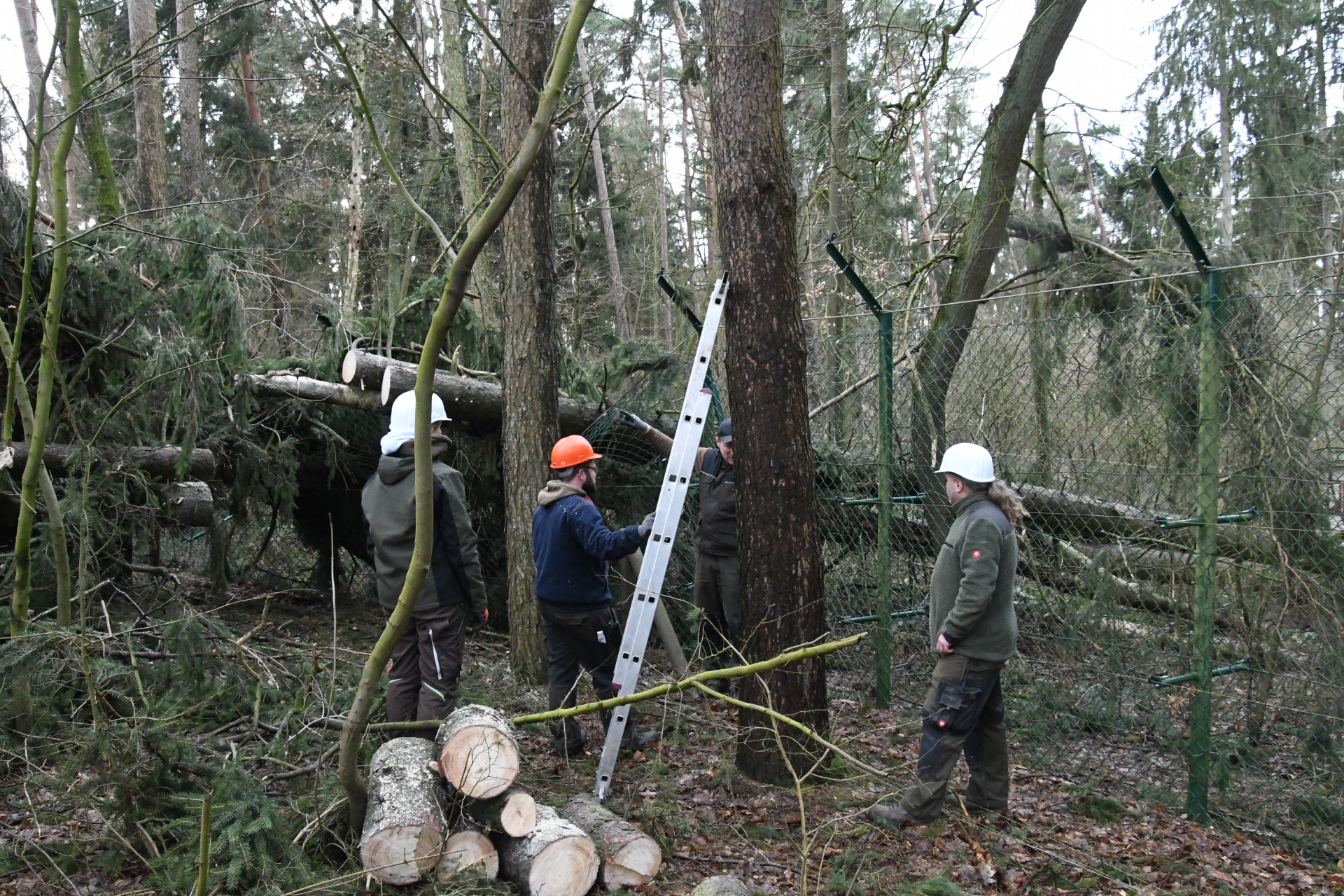 Das Sturmtief vom Wochenende hat auch im BÄRENWALD Müritz schwere Schäden angerichtet. In dem Schutzzentrum hat der Orkan etwa 20 Bäume entwurzelt. Zum Teil wurden dabei auch Zaunanlagen stark in Mitleidenschaft gezogen. Die meisten der 14 Braunbären befinden sich derzeit in Winterruhe. Dies ist auch der Grund dafür, dass die Gehege derzeit nicht betreten werden können. Um sicherzugehen, dass es den Bären gut geht, überprüften Mitglieder der Freiwilligen Feuerwehr heute die Winterhöhlen.