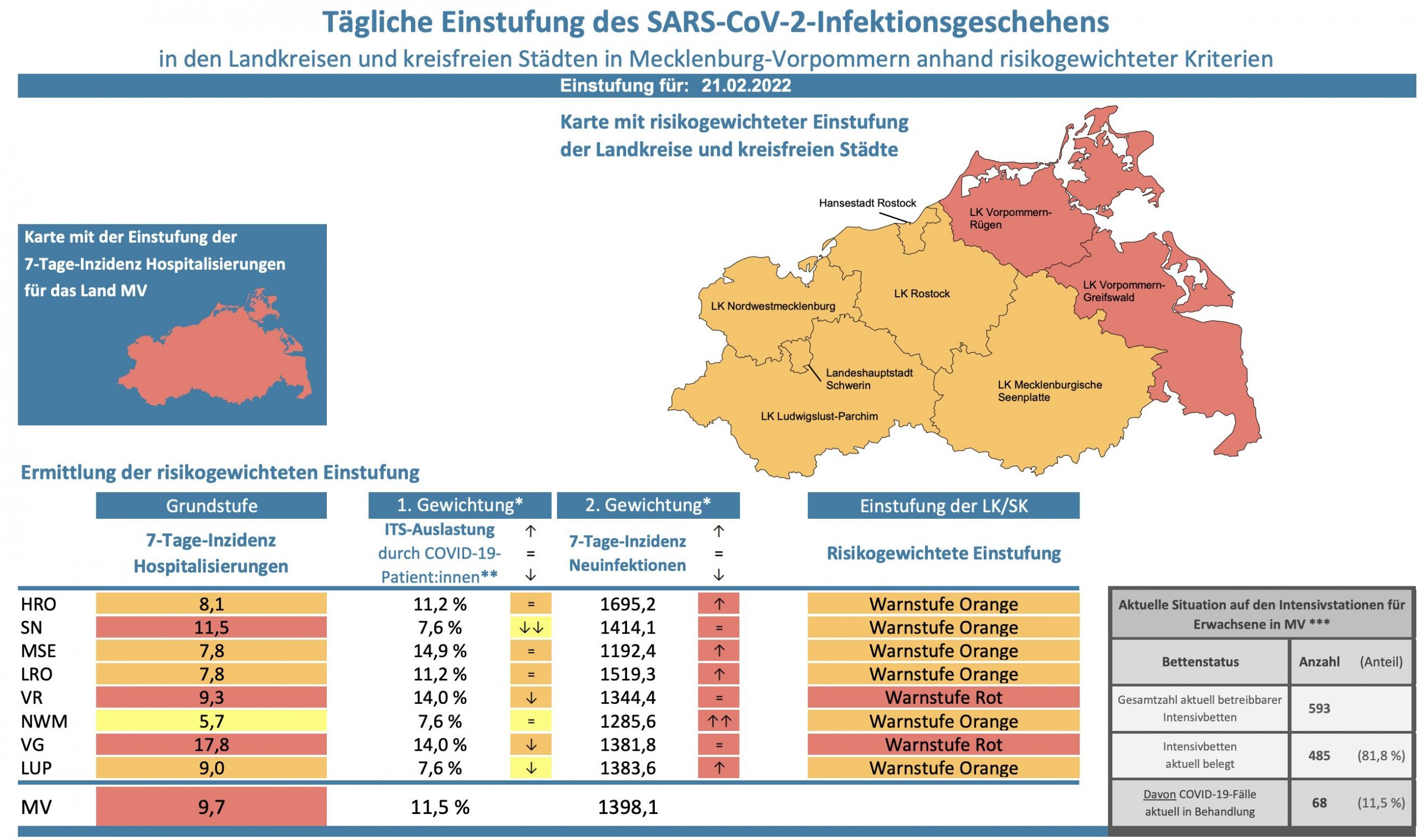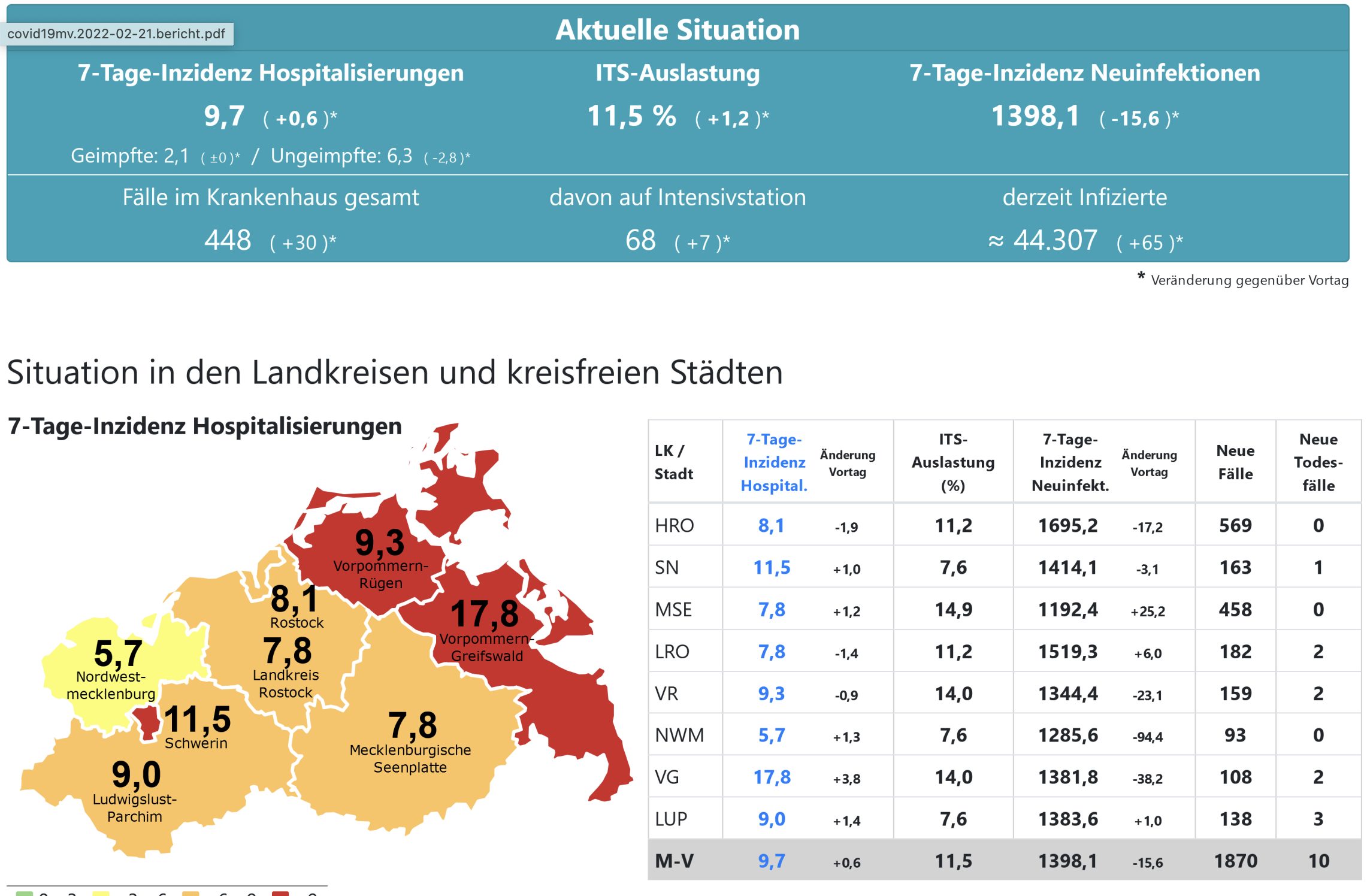 Die Hospitalisierung in ganz Mecklenburg-Vorpommern liegt heute bei 9,7, die Inzidenz des Landes sinkt von 1414,5 auf 1398,1. Das Land Mecklenburg-Vorpommern meldet heute 1870 Neuinfektionen zehn neue Todesfälle.