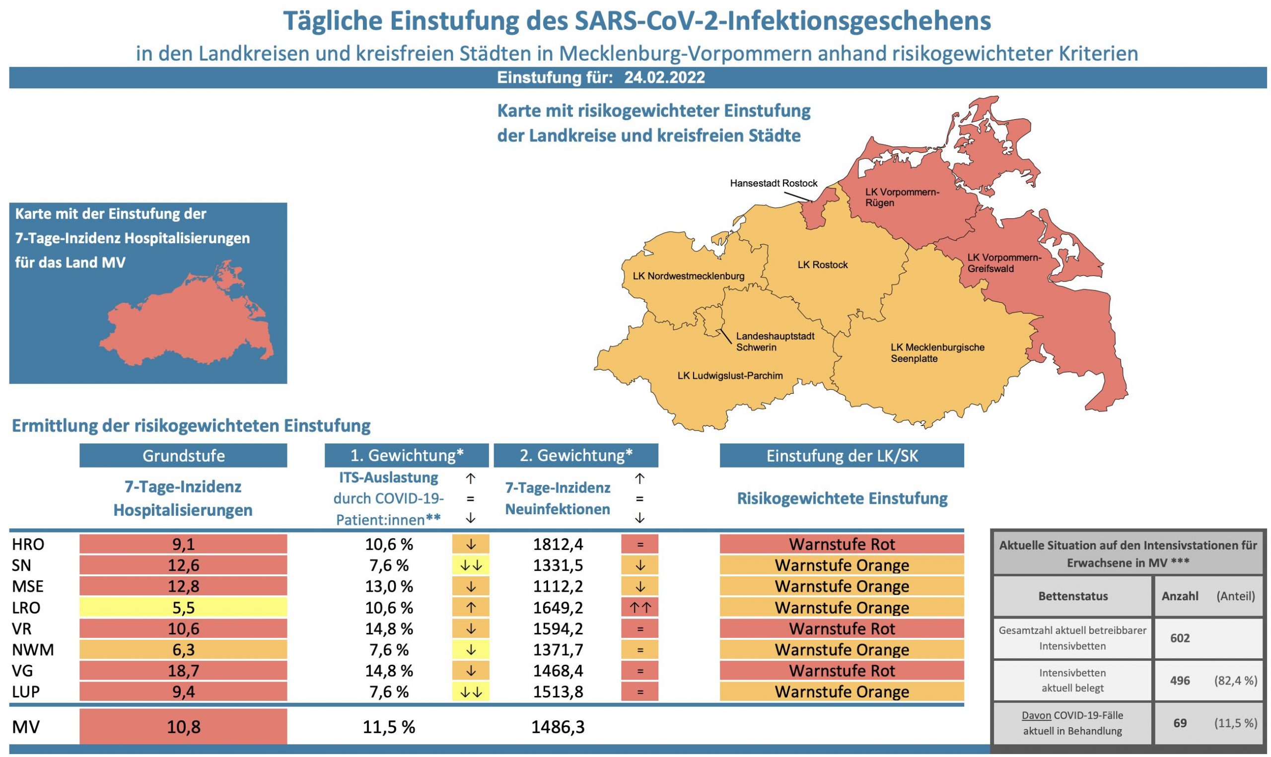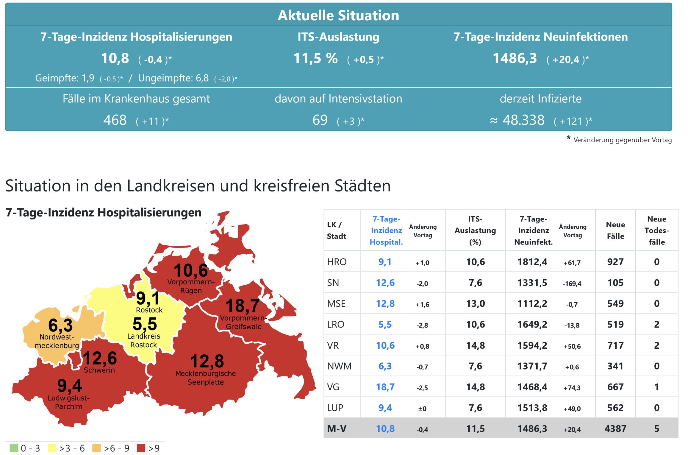 Die Hospitalisierung in ganz Mecklenburg-Vorpommern liegt heute bei 10,8, die Inzidenz des Landes steigt von 1466,6 auf 1486,3. Das Land Mecklenburg-Vorpommern meldet heute 4387 Neuinfektionen und fünf neue Todesfälle.
