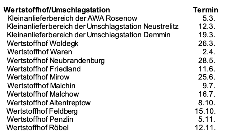 Alle weiteren Termine werden gesondert bekannt gegeben. Die Adressen der Wertstoffhöfe und Kleinanlieferanlagen finden Sie auf der Homepage des Landkreises unter www.lk-mecklenburgische-seenplatte.de. Nachweise über die umweltgerechte Entsorgung werden am Schadstoffmobil nicht ausgestellt.