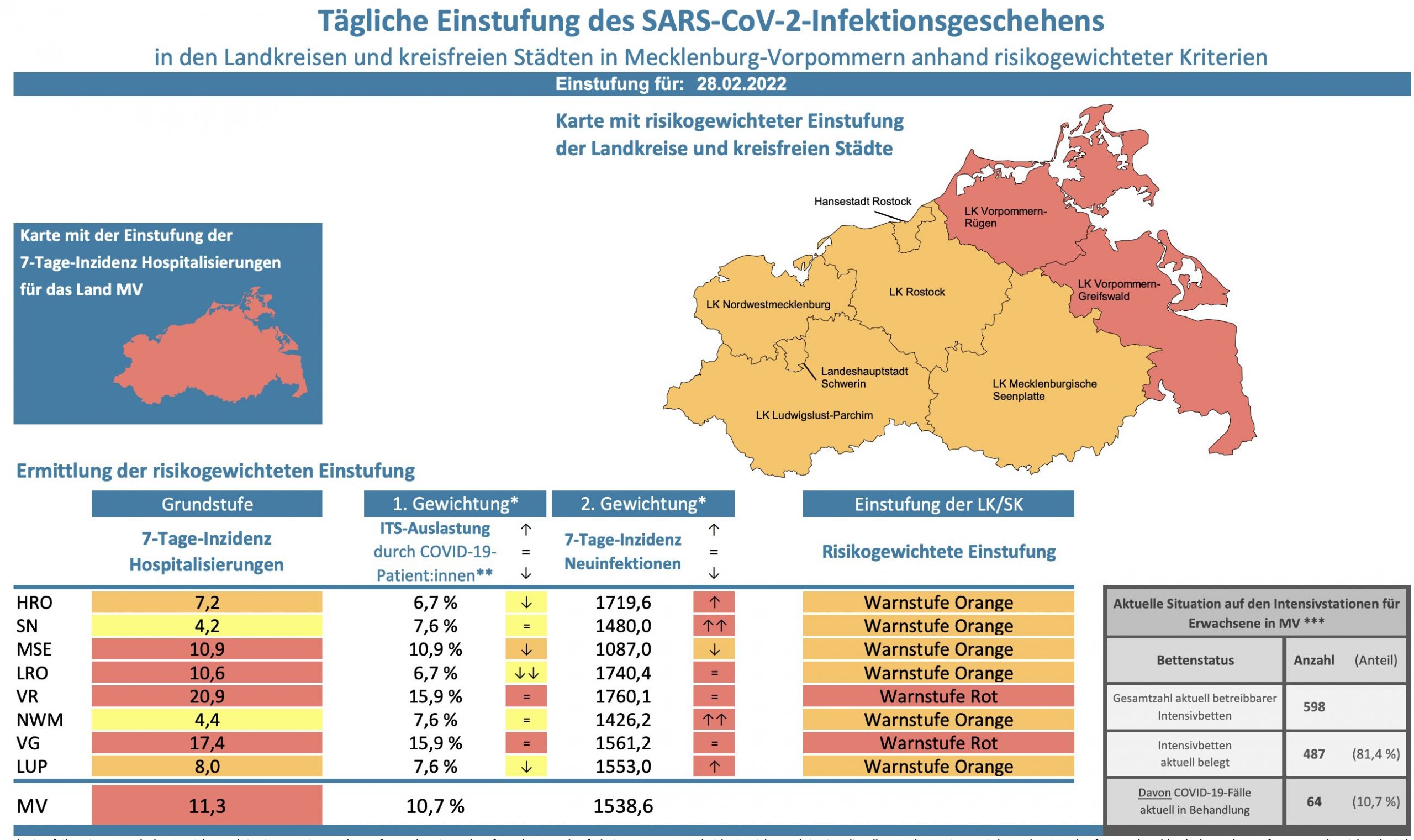 Die Hospitalisierung in ganz Mecklenburg-Vorpommern liegt heute bei 11,3, die Inzidenz des Landes steigt von 1483,3 auf 1538,6. Das Land Mecklenburg-Vorpommern meldet heute 2839 Neuinfektionen und neun neue Todesfälle.