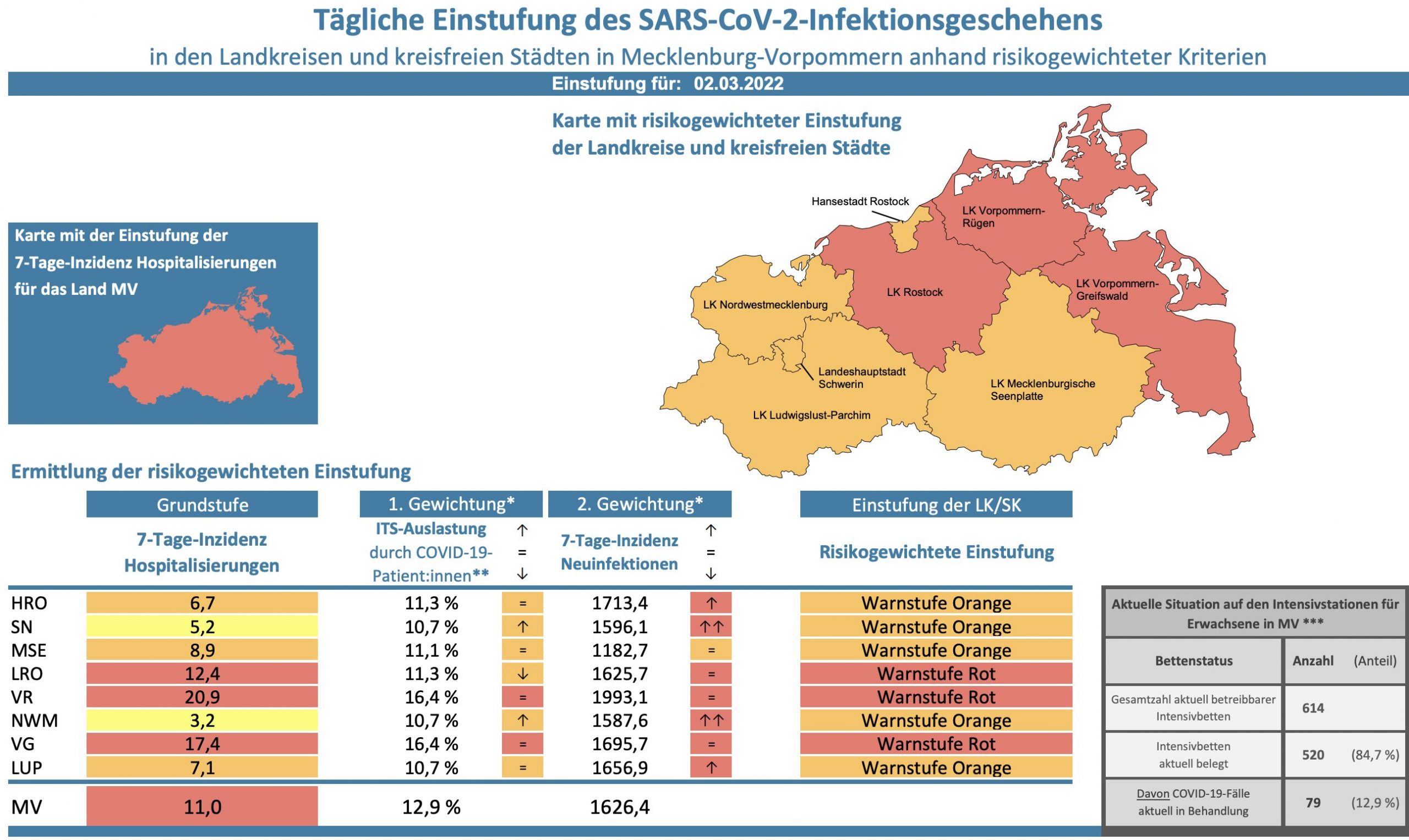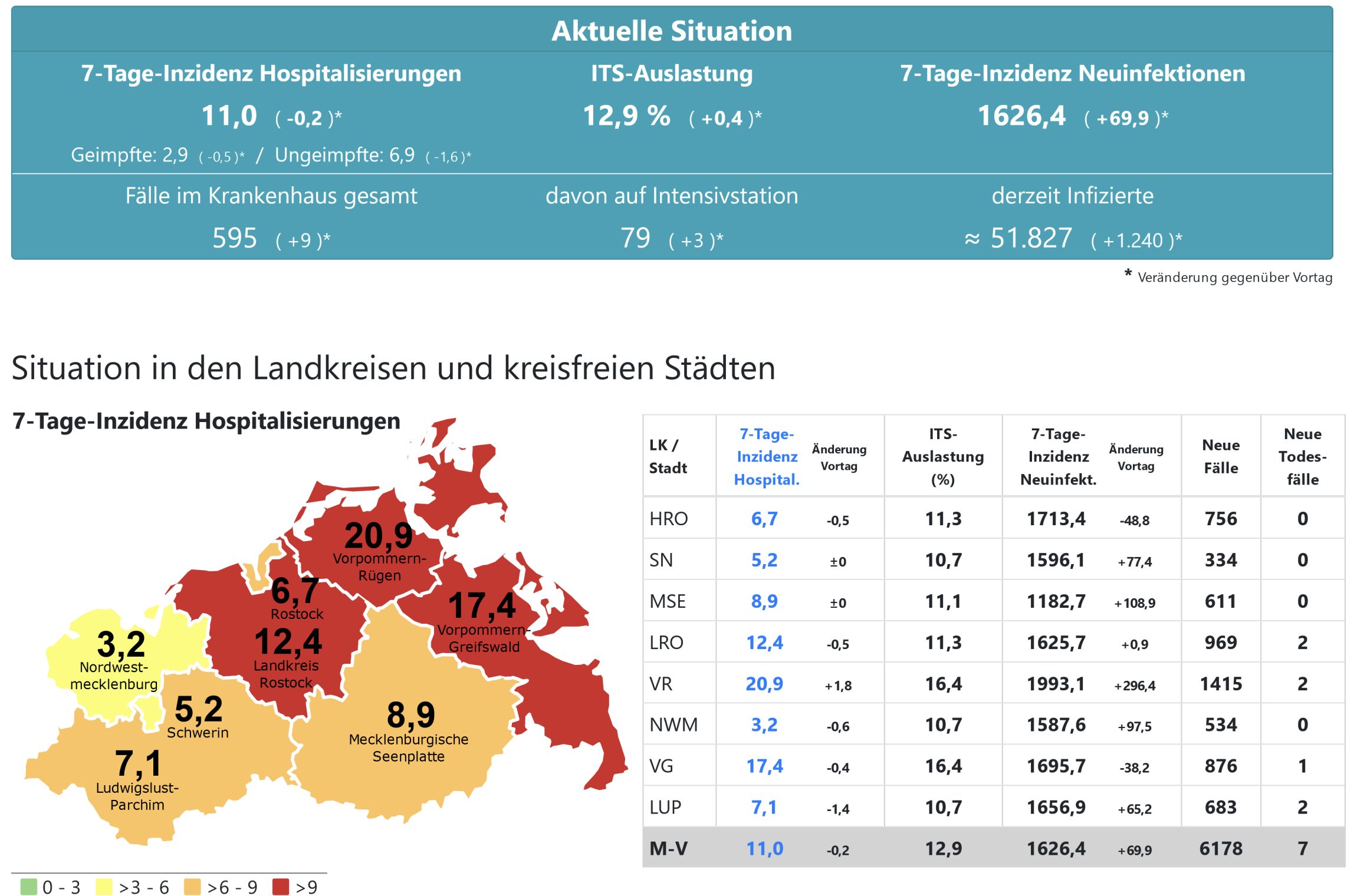 Die Hospitalisierung in ganz Mecklenburg-Vorpommern liegt heute bei 11,0, die Inzidenz des Landes steigt von 1557,4 auf 1626,4. Das Land Mecklenburg-Vorpommern meldet heute 6178 Neuinfektionen und sieben neue Todesfälle.