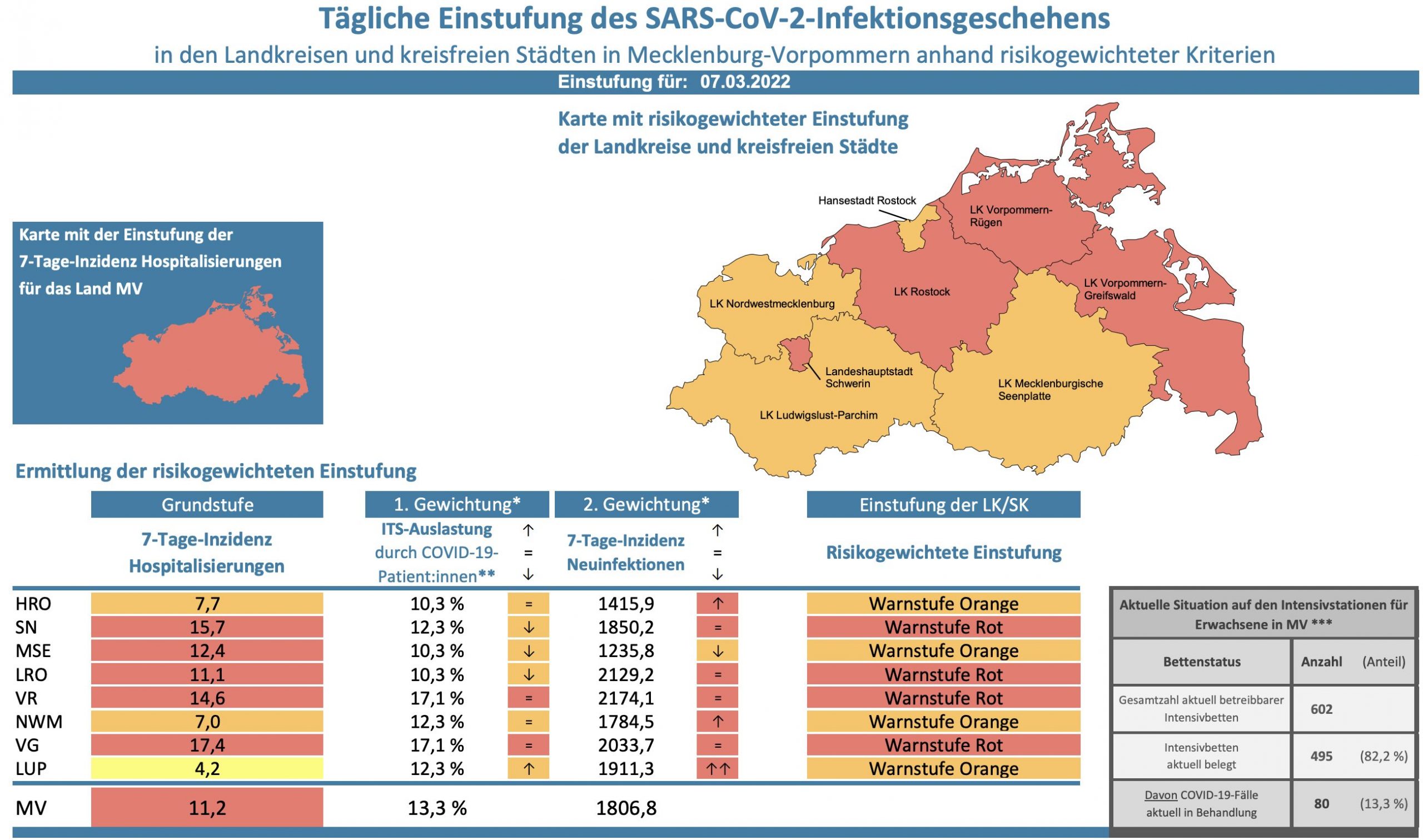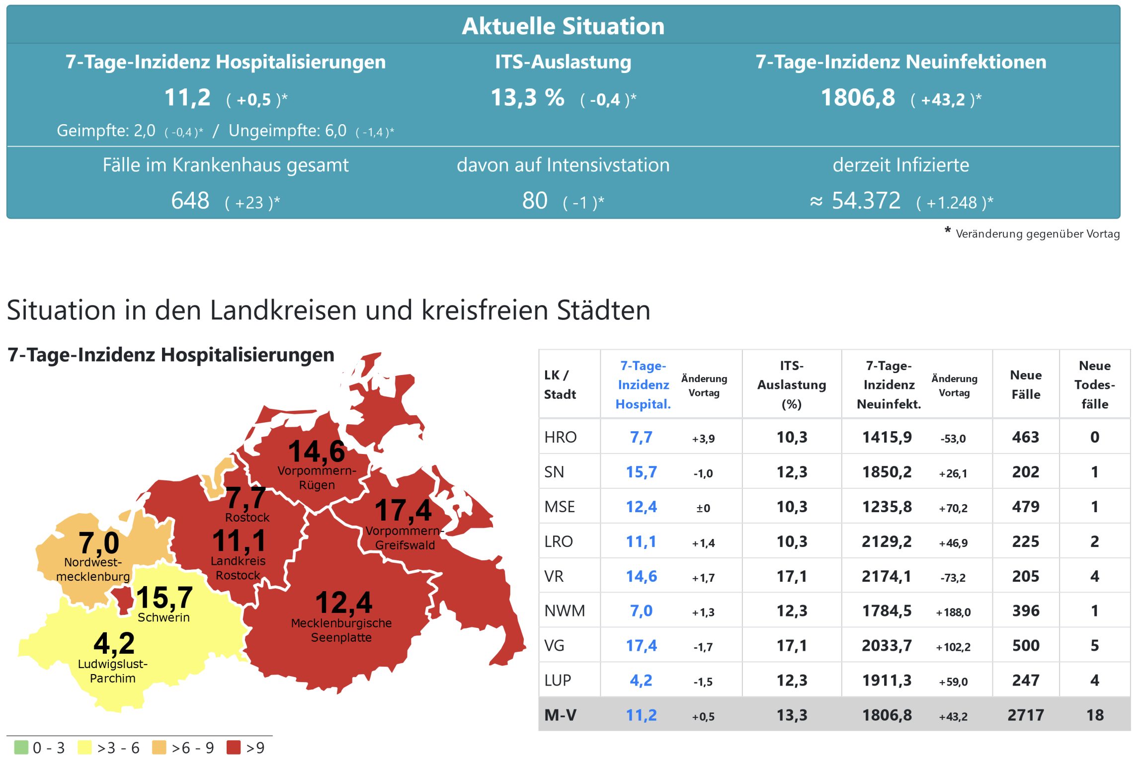 Die Hospitalisierung in ganz Mecklenburg-Vorpommern liegt heute bei 11,2, die Inzidenz des Landes steigt von 1764,7 auf 1806,8. Das Land Mecklenburg-Vorpommern meldet heute 2717 Neuinfektionen und 18 neue Todesfälle.