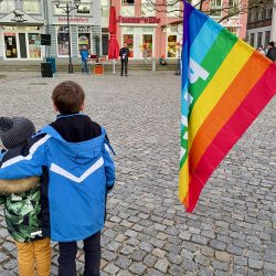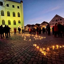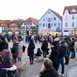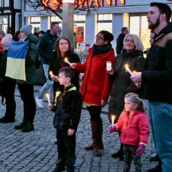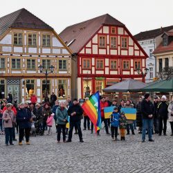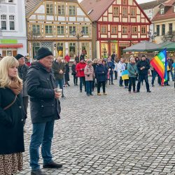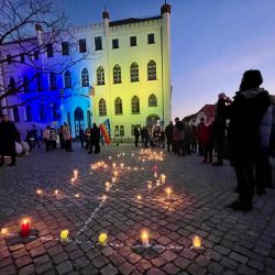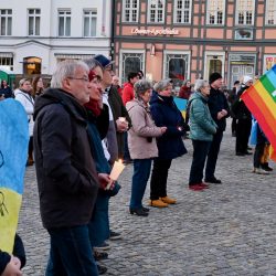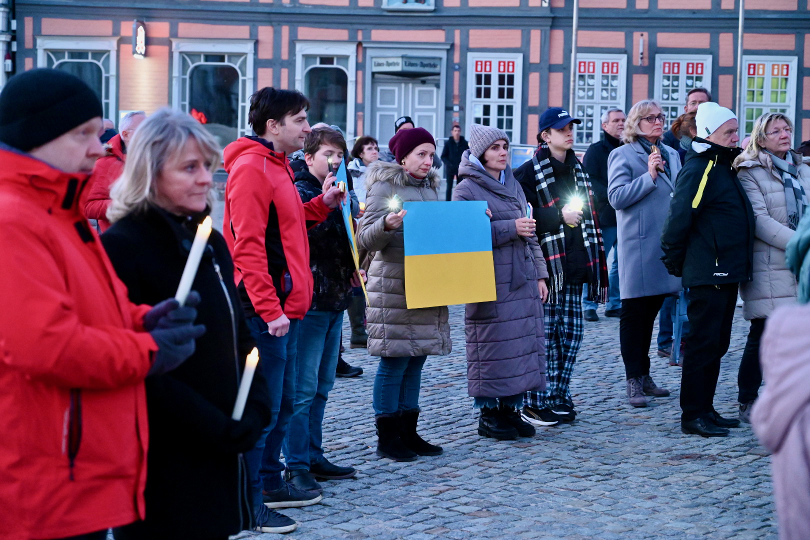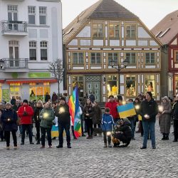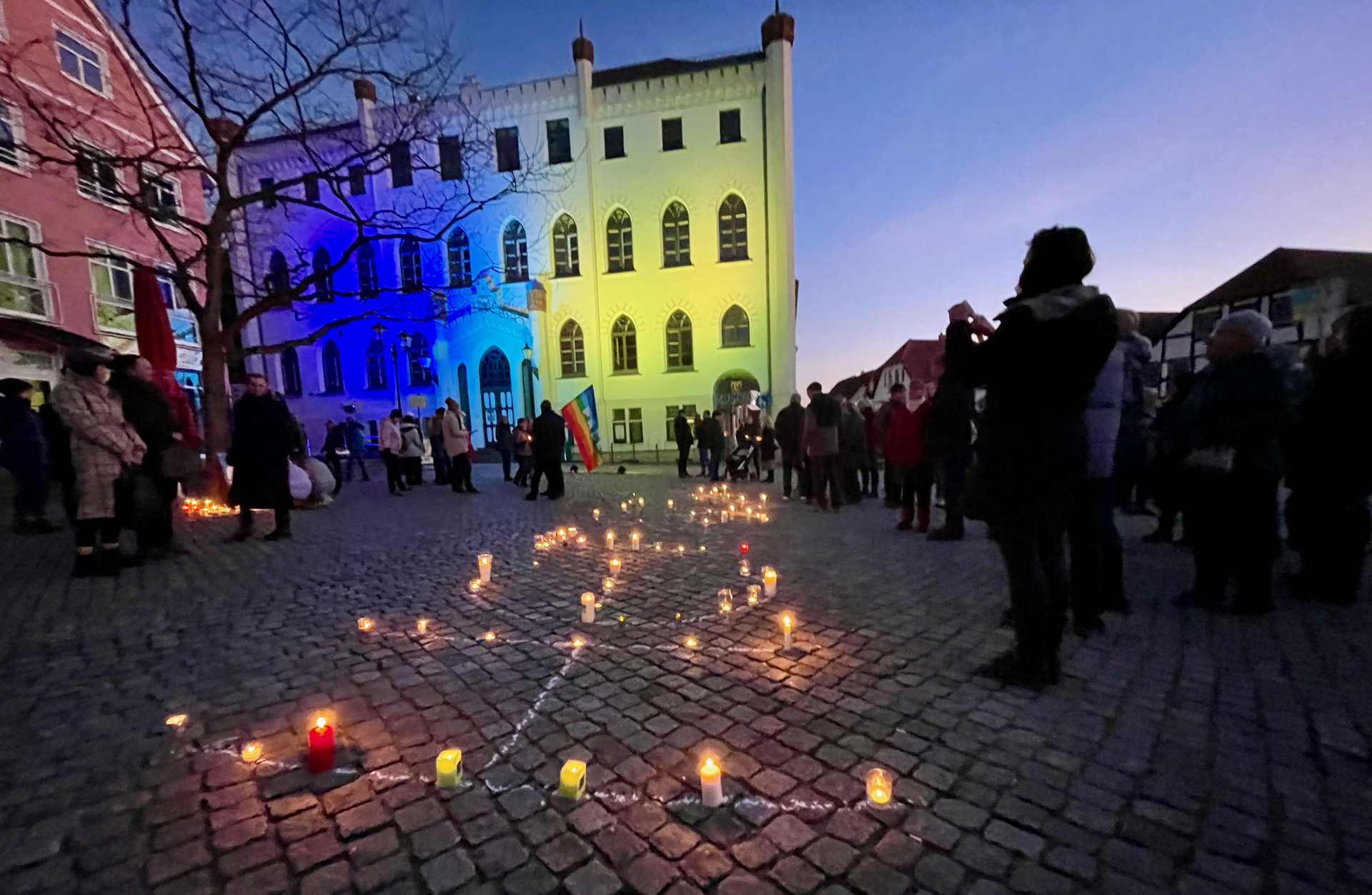 Menschen mit Kerzen und Plakaten in der Hand, das Warener Rathaus blau-gelb angestrahlt, Politiker, denen die Stimme stockt und eine Frau aus der Ukraine, die ihre beiden kleinen Söhne ganz fest an sich drückt, während sie bitterlich weint: Auf dem Neuen Markt in Waren haben heute Abend rund 300 Frauen, Männer, Kinder und Jugendliche ihre Solidarität mit der Ukraine bekundet und ein Zeichen für den Frieden gesetzt. Darunter die ersten ukrainischen Frauen und Kinder, die vor wenigen Stunden in Waren angekommen sind. Sie weinen, aber sie sind auch erleichtert, hier in Sicherheit zu sein und auf so viel Hilfsbereitschaft zu stoßen.