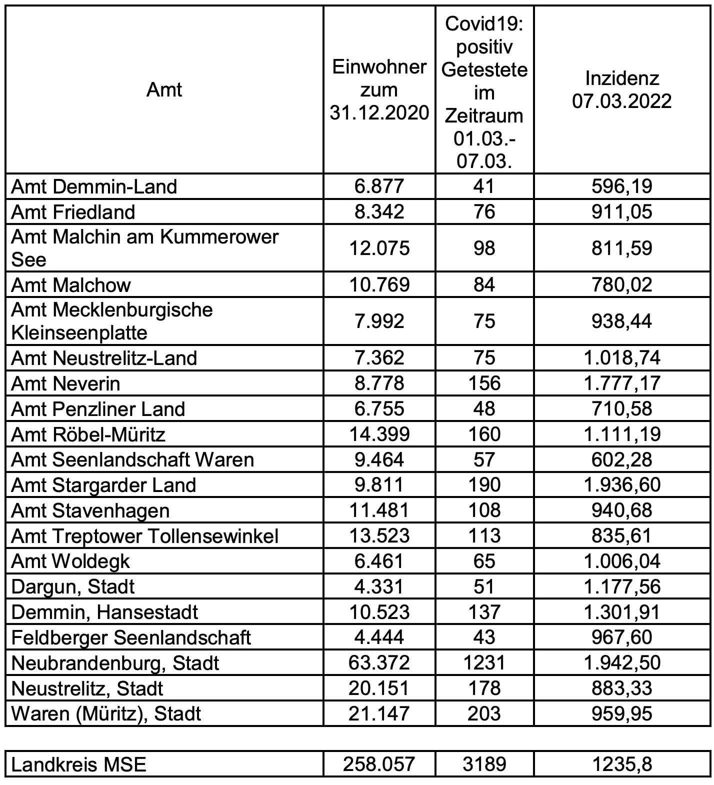 Im heutigen Artikel finden Sie heute wie jeden Dienstag die Inzidenzen des Landkreises Mecklenburgische Seenplatte – aufgeschlüsselt nach Städten und Ämtern.