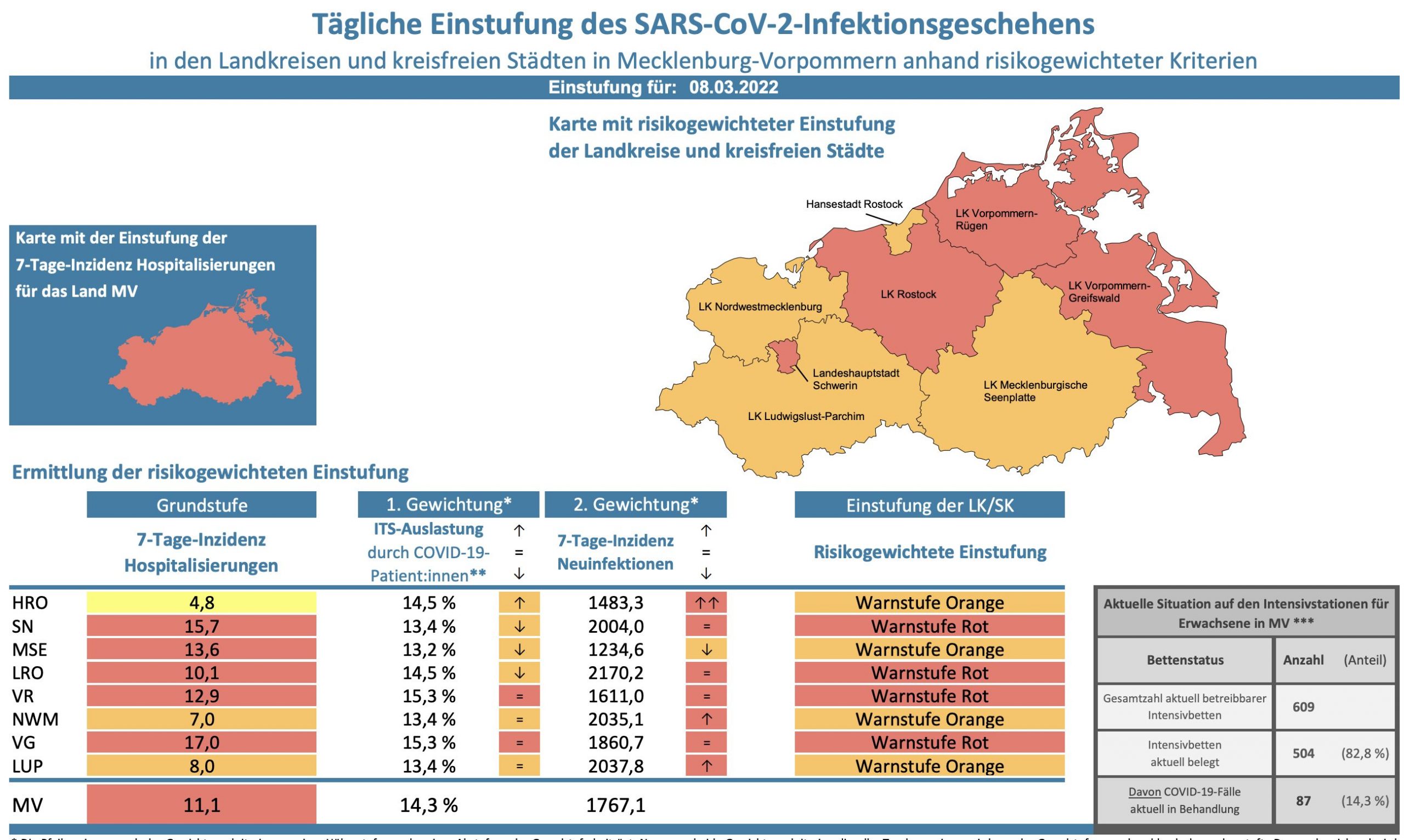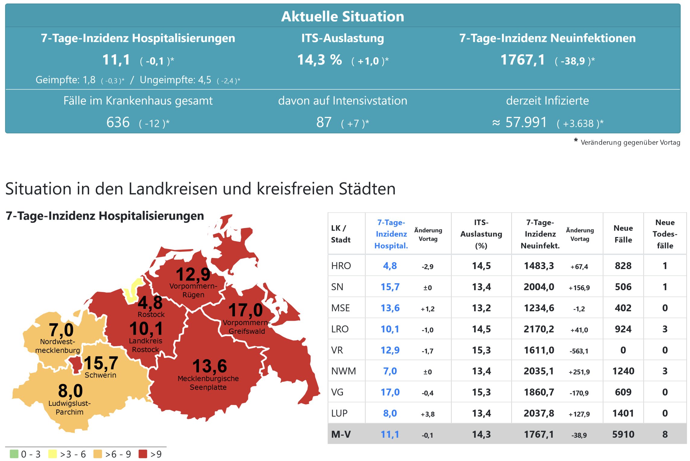 Die Hospitalisierung in ganz Mecklenburg-Vorpommern liegt heute bei 11,1, die Inzidenz des Landes sinkt von 1806,8 auf 1767,1. Das Land Mecklenburg-Vorpommern meldet heute 5910 Neuinfektionen und 8 neue Todesfälle.