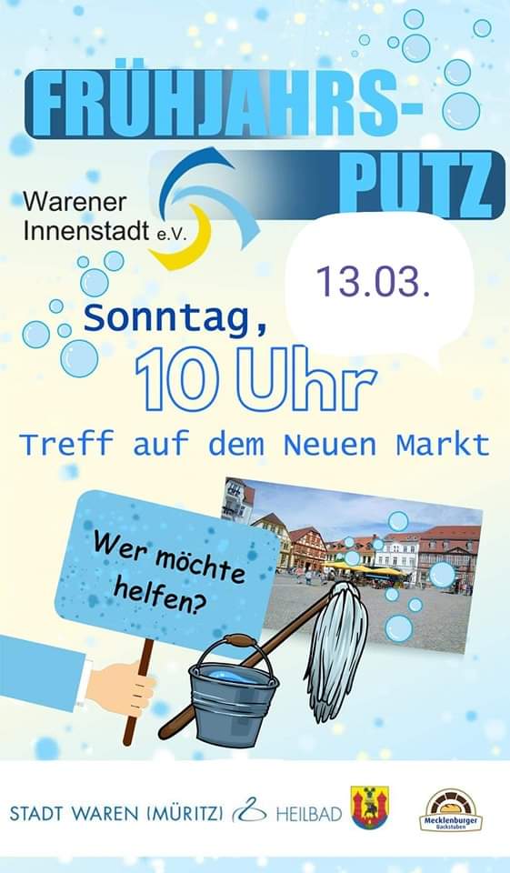 Ärmel hochkrempeln heißt es am kommenden Sonntag, 13. März, in Waren. Der Warener Innenstadtverein ruft wieder zum Frühjahrsputz auf. Los geht’s um 10 Uhr, Treffpunkt ist auf dem Neuen Markt. Nach getaner Arbeit stellt der Innenstadtverein eine Bratwurst in Aussicht. Und er kündigt schon mal an: Ostern tanzen auf dem Markt nicht nur die Eier.