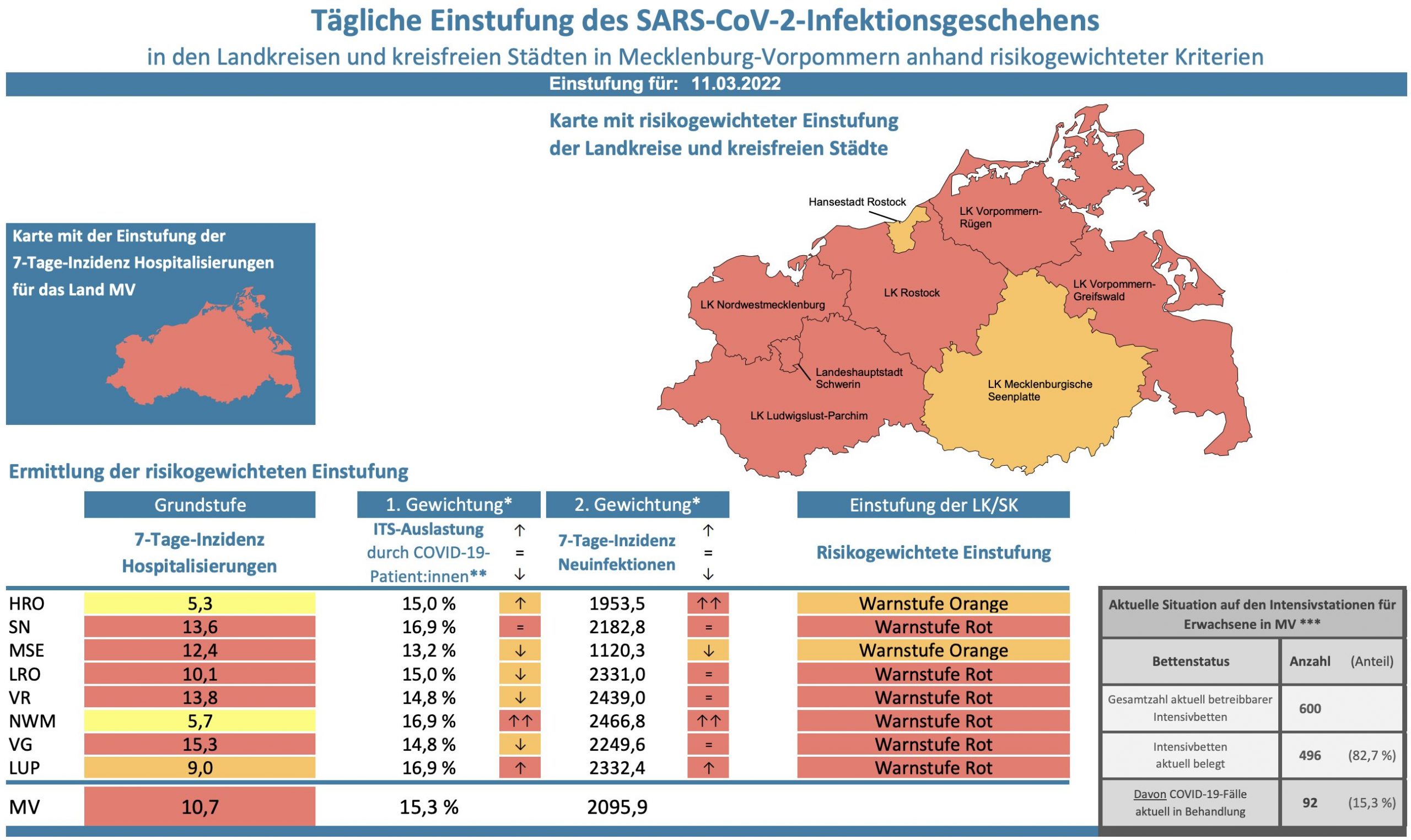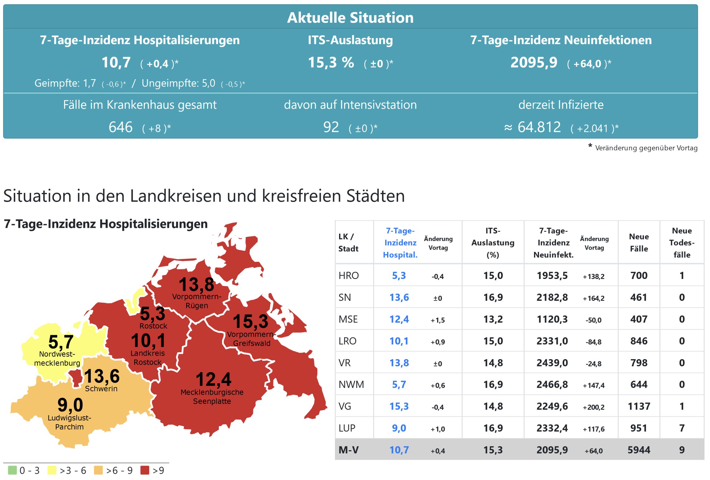 Die Hospitalisierung in ganz Mecklenburg-Vorpommern liegt heute bei 10,7, die Inzidenz des Landes steigt von 2033,6 auf 2095,9. Das Land Mecklenburg-Vorpommern meldet heute 5944 Neuinfektionen und 9 neue Todesfälle.
