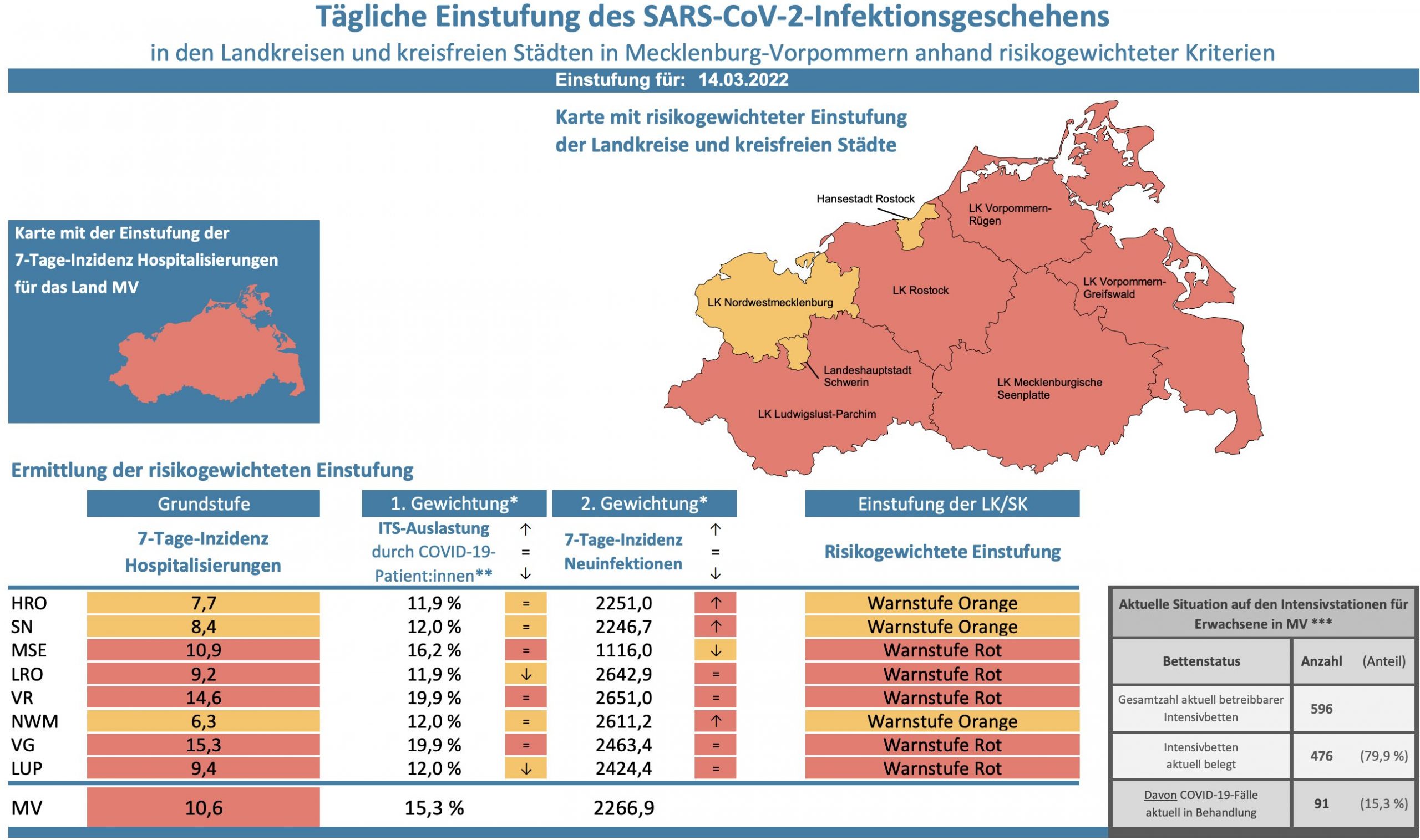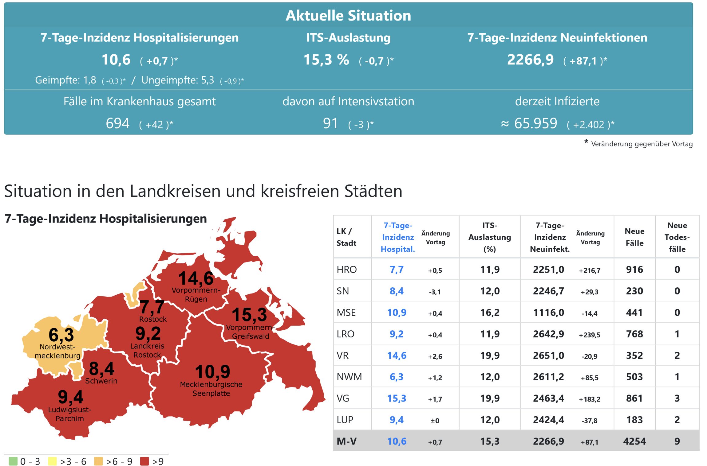 Die Hospitalisierung in ganz Mecklenburg-Vorpommern liegt heute bei 10,6, die Inzidenz des Landes steigt von 2180,5 auf 2266,9. Das Land Mecklenburg-Vorpommern meldet heute 4254 Neuinfektionen und neun neue Todesfälle.