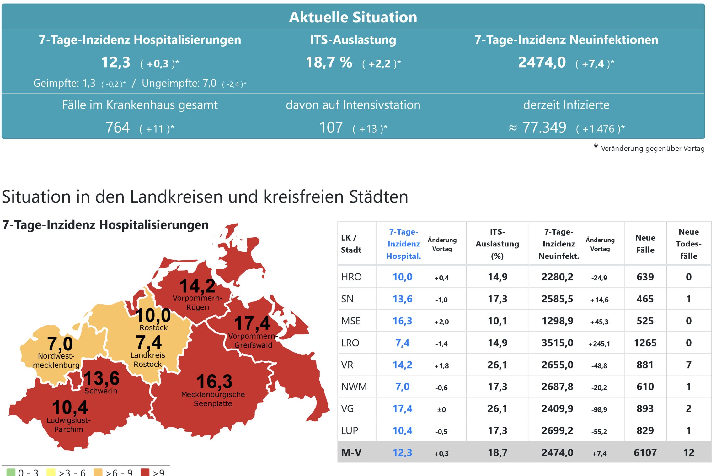 Die Hospitalisierung in ganz Mecklenburg-Vorpommern liegt heute bei 12,3, die Inzidenz des Landes steigt von 2468,1 auf 2474,0. Das Land Mecklenburg-Vorpommern meldet heute 6107 Neuinfektionen und 12 neue Todesfälle.