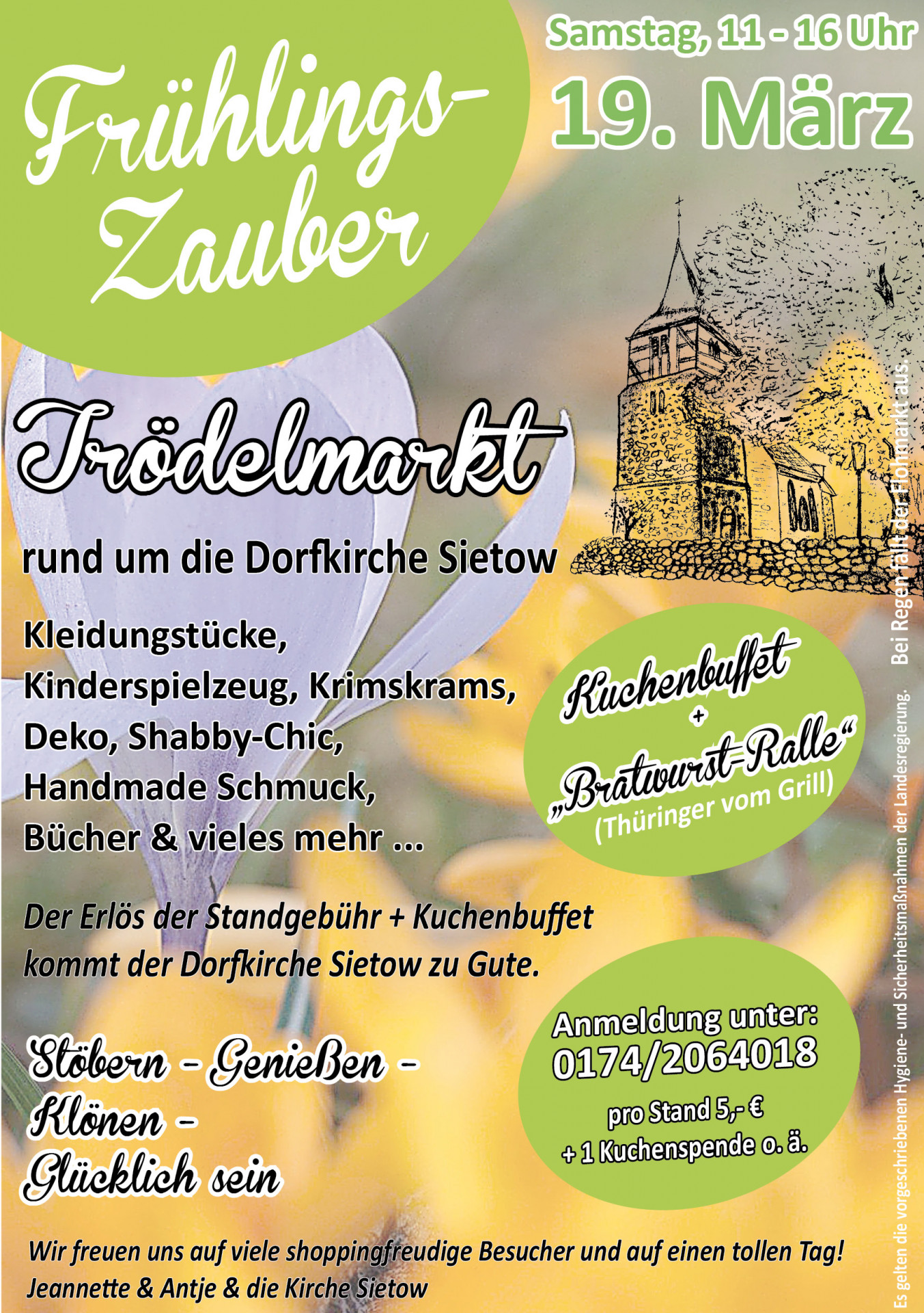 Frühlingszauber heißt es heute von 11 bis 16 Uhr an der Dorfkirche in Sietow. Jeanette und Antje haben wieder einen großen, abwechslungsreichen Flohmarkt organisiert. Die Besucher können an über 50 Ständen „trödeln“. Außerdem gibt es selbst gebackenen Kuchen, Deftiges vom Buffet und Thüringer Bratwurst vm Grill. Auch Musik fehlt nicht.