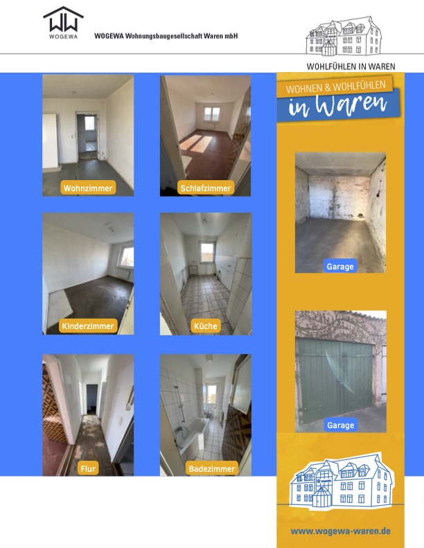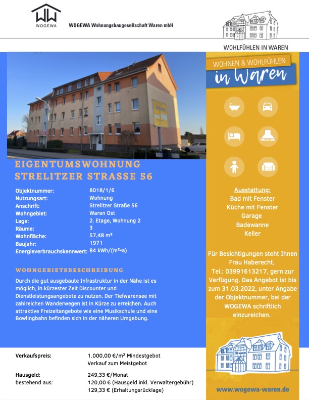 Die Wohnungsbaugesellschaft Waren (Wogewa) verkauft derzeit zwei Eigentumswohnungen in der Strelitzer Straße. Beide haben drei Zimmer und liegen in der zweiten Etage. Es gibt neben einem Keller auch eine Garage. Besichtigungstermine können noch vereinbart werden.