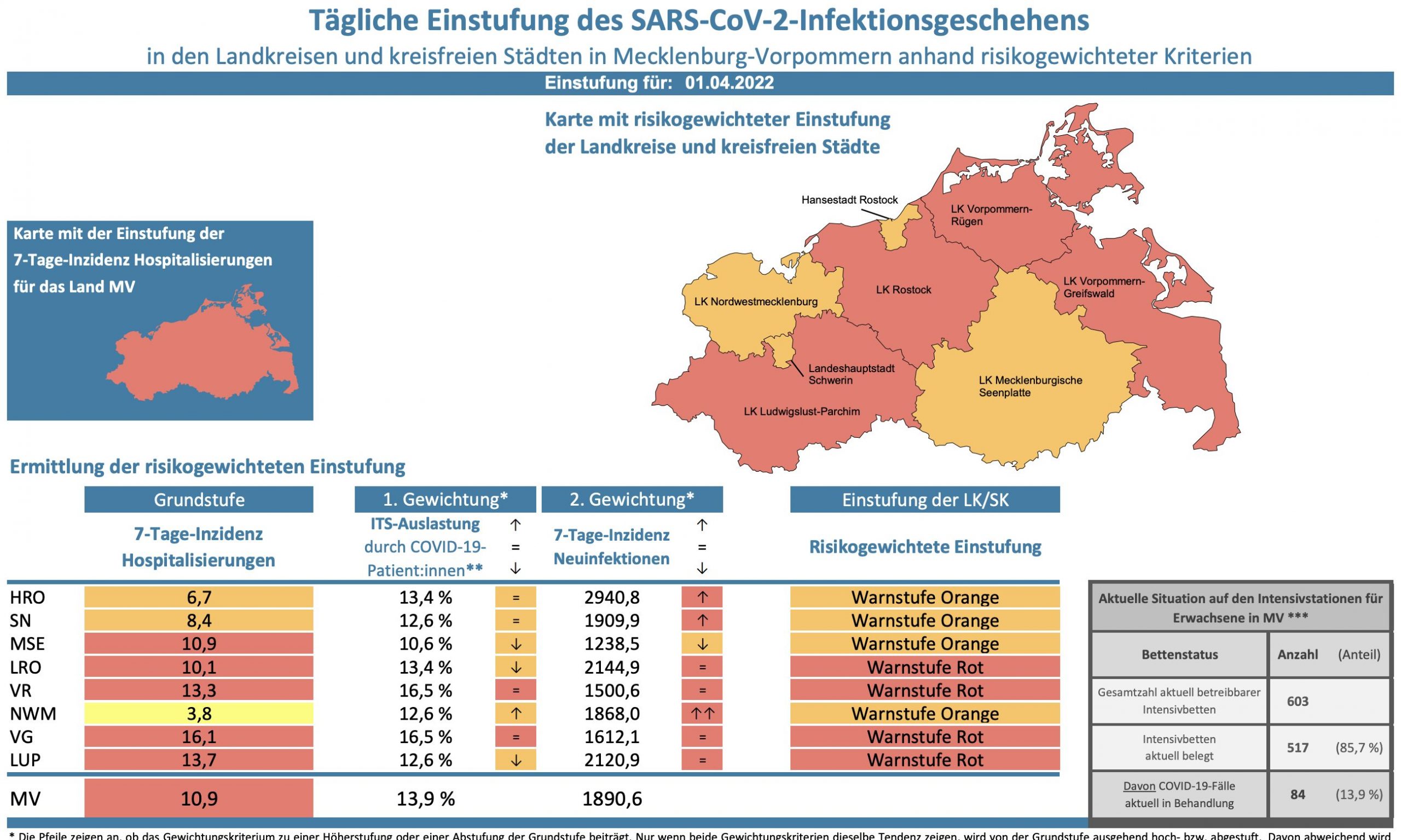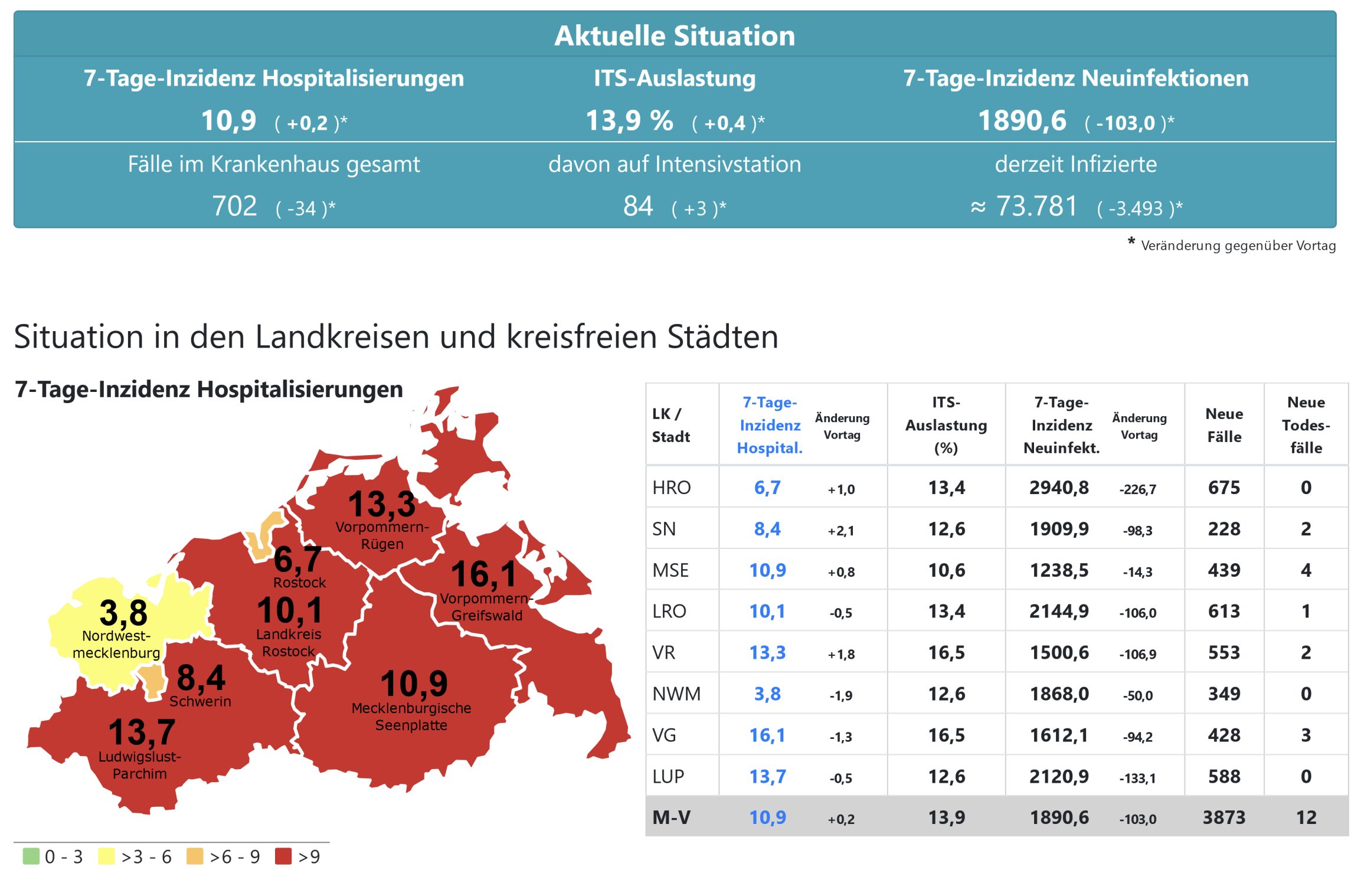 Die Hospitalisierung in ganz Mecklenburg-Vorpommern liegt heute bei 10,9, die Inzidenz des Landes sinkt von 1994,3 auf 1890,6. Das Land Mecklenburg-Vorpommern meldet heute 3873 Neuinfektionen sowie 12 neue Todesfälle.