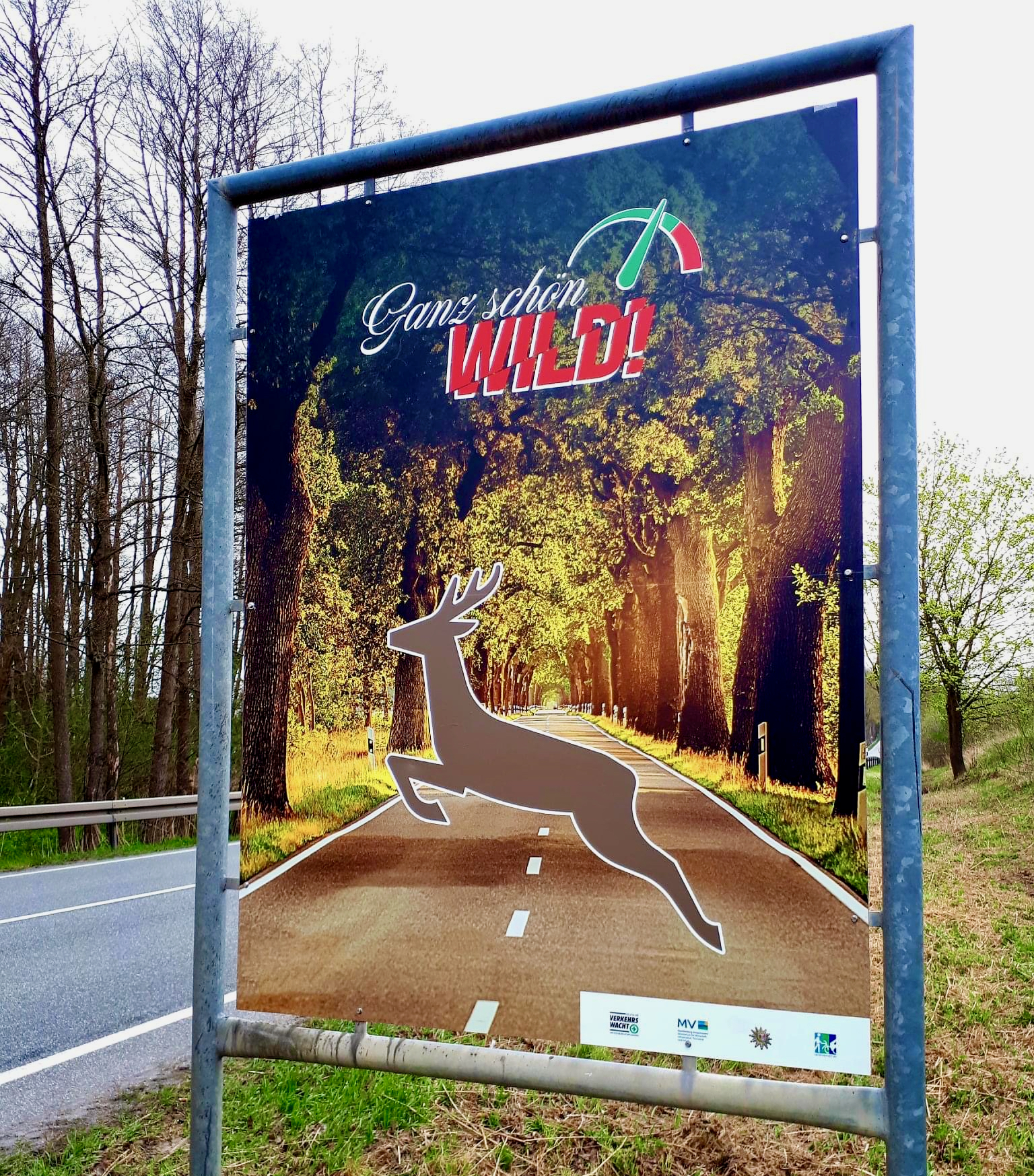 Wie aus dem Nichts tauchen sie manchmal auf: Hirsche, Rehe, Wildschweine, aber auch kleinere Wildtiere wie Hasen, Otter und Marder. Wer jetzt zu schnell fährt, abgelenkt ist oder auszuweichen versucht, ist in großer Gefahr. Darauf weist die Landesverkehrswacht Mecklenburg-Vorpommern mit ihrer Aktion „Ganz schön WILD!“ hin. Bestandteil der Aktion ist ein Landstraßen-Plakat. Der aus dem Verkehrszeichen „Wildwechsel“ bekannte Rehbock springt mit mächtigem Satz auf die Fahrbahn, so, wie es landesweit jährlich tausendfach passiert. Eine Tachonadel im „grünen Bereich“ weist darauf hin, dass angemessene Geschwindigkeiten helfen, schwere Unfälle zu vermeiden und Unfallfolgen zu mindern.