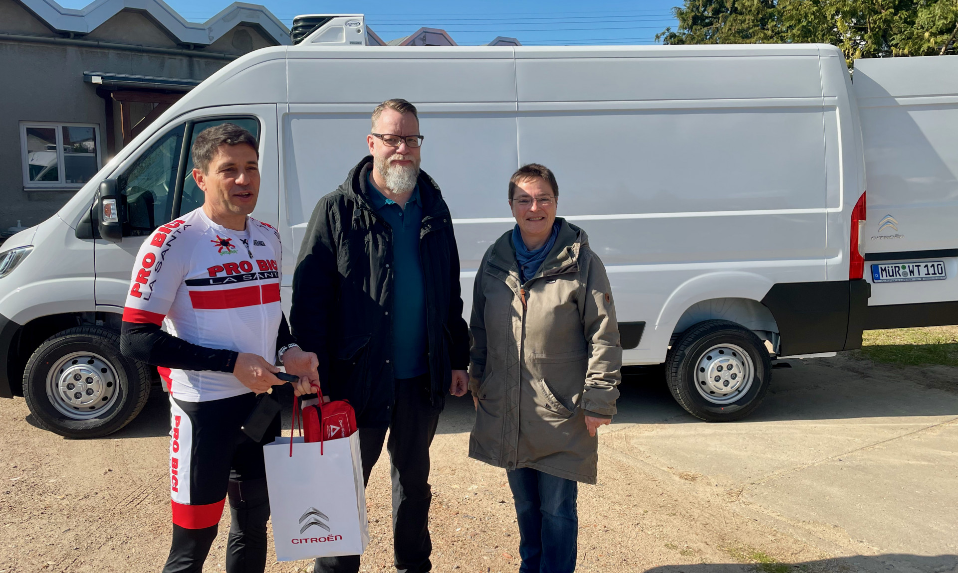 Foto oben: Bernd Lehmann vom Citroen-Autohaus Uecker Silz übergibt den neuen Kühlwagen an André Rath und Sabine Jonitz von der Diakonie. Der Autoverkäufer hat sich übrigens ganz umweltfreundlich zurück auf den Weg nach Silz gemacht – auf dem Fahrrad.