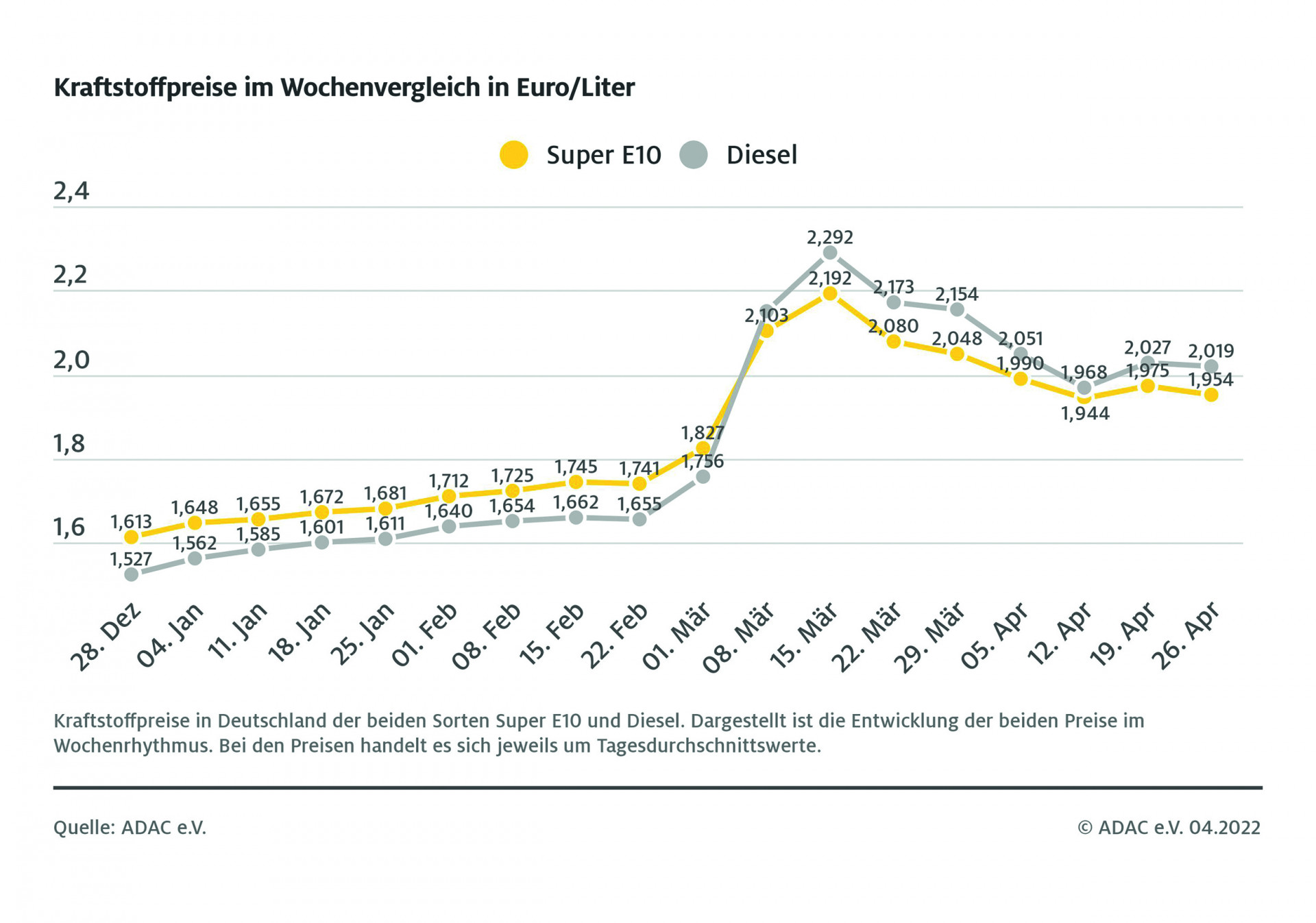 Diesel ist seit dem Allzeithoch vom 10. März sogar um rund 30 Cent billiger geworden, liegt aber weiter über der Marke von zwei Euro. Hier spielen auch kriegsbedingte Sonderfaktoren eine Rolle. So bezieht Deutschland größere Mengen fertigen Diesel-Kraftstoffs aus Russland, was sich ebenfalls nicht preisdämpfend auswirkt. Dennoch muss es bei Diesel laut ADAC schrittweise zu einer Normalisierung der Preissituation kommen.