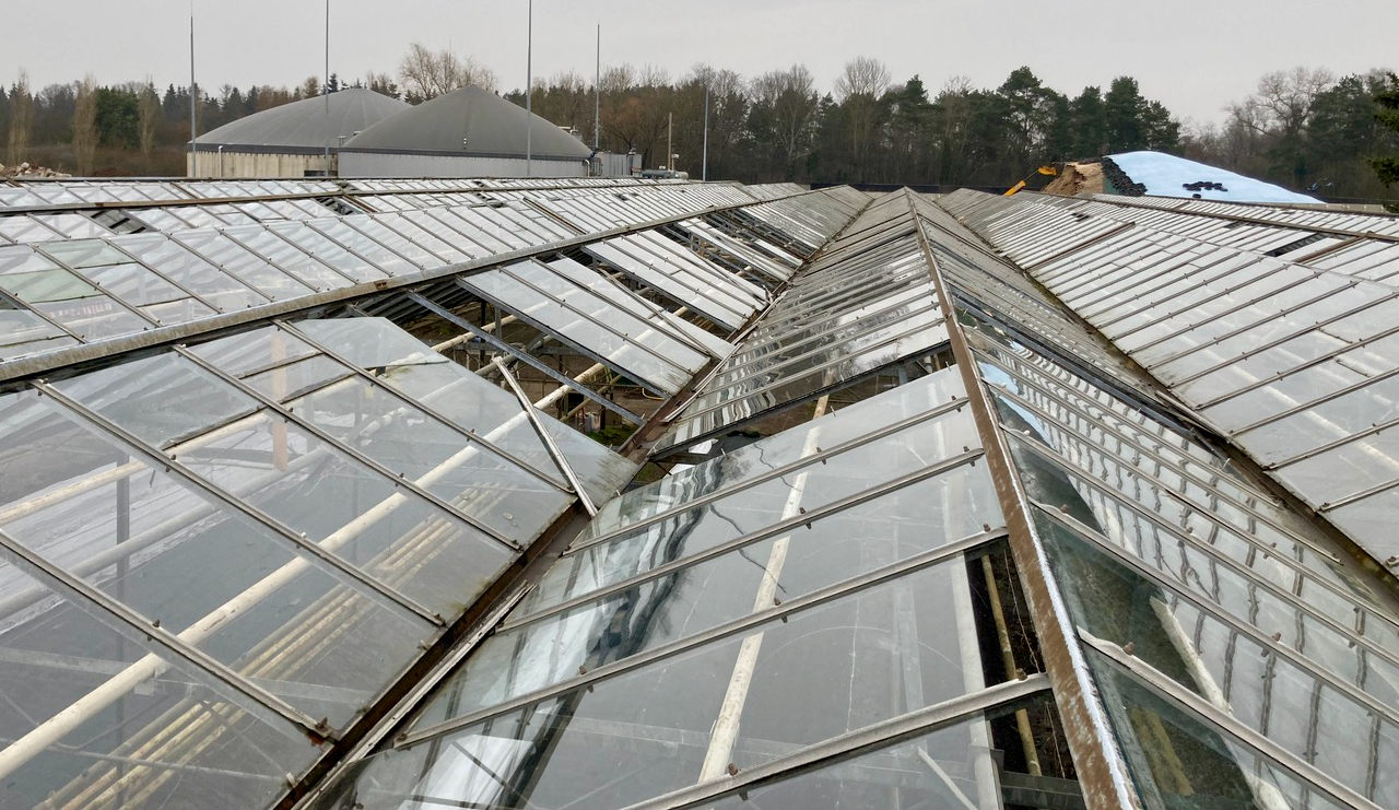 Nach dem Sturm mussten das Glasdach des betroffenen Grundstückes umgehend entfernt werden, ein Anbau wäre sonst zu gefährlich geworden. Die Kosten dafür bedrohen jetzt die Existenz des kleinen Unternehmens. Aaron Göpper beantwortet zu seiner Crowdfunding-Aktion auch die Frage, wie es um eine Versicherung steht. Die Antwort ist einfach: „Für eine Versicherung wäre eine lückenlose Verglasung notwendig. Seit der Übernahme vor vier Jahren haben wir dies allerdings nur bei einem der knapp 50 Jahre alten Gewächshäuser aus eigener Kraft realisieren können.“