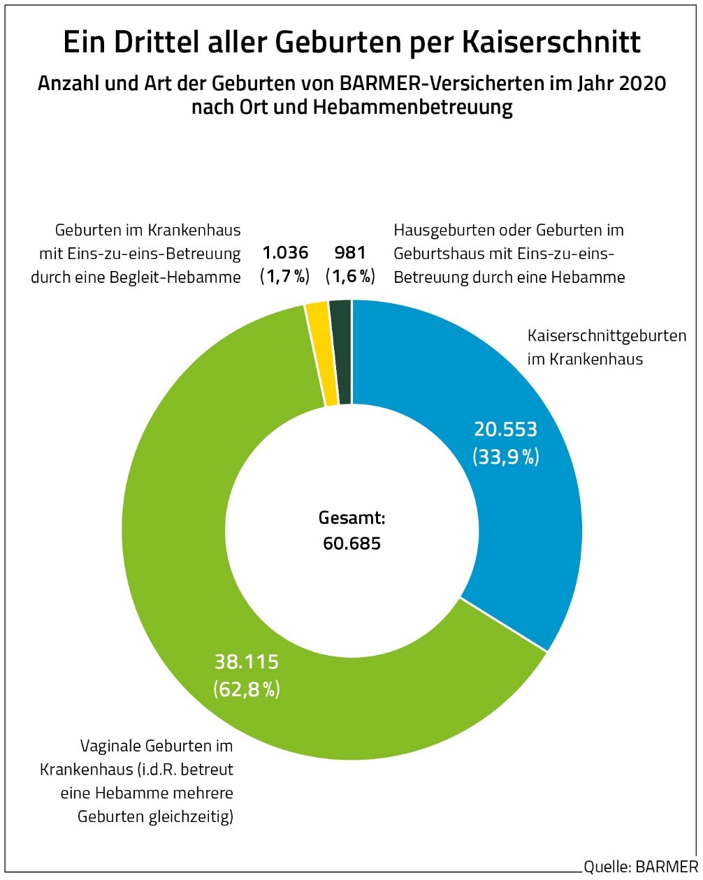 Ein Drittel aller Kinder kommt in Deutschland nach wie vor per Kaiserschnitt zur Welt. Zugleich profitiert nur eine Minderheit werdender Mütter von einer Eins-zu-eins-Betreuung durch eine Hebamme während der Geburt. Das geht aus Zahlen zu Geburten von BARMER-versicherten Frauen aus dem Jahr 2020 hervor. Demnach wurde bei 20.553 von 60.685 Geburten das Kind per Kaiserschnitt zur Welt gebracht. Bei lediglich 1,7 Prozent (1.036) der Geburten im Krankenhaus stand eine Begleit-Hebamme eins zu eins zur Seite.