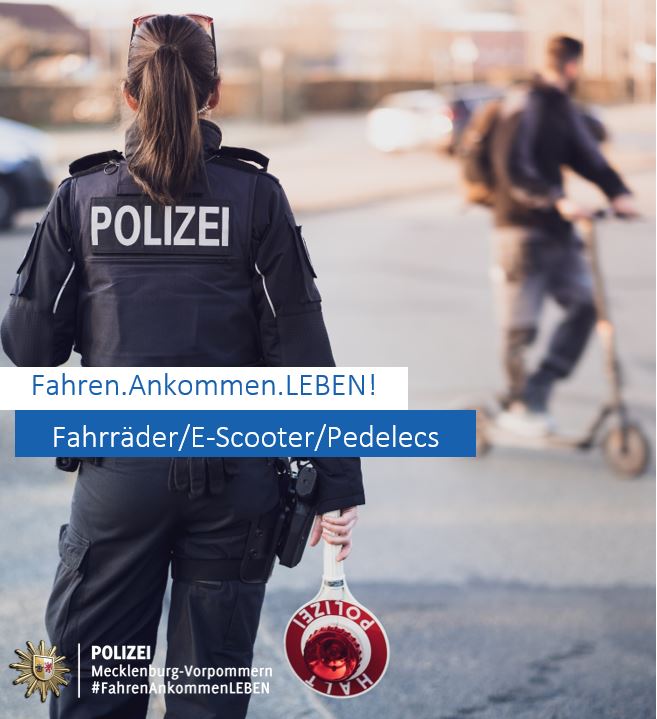Mit dem Themenschwerpunktkomplex „Fahrräder/E-Scooter/Pedelecs“ gehen die monatlichen Kontrollen der Kampagne „Fahren.Ankommen.LEBEN“ in eine neue Runde: Die Zielgruppe der Kontrollen liegt im Juni neben den Radfahrern demnach auch auf Nutzern von Pedelecs (Räder mit Trethilfe und einem elektromotorischen Hilfsantrieb), S-Pedelecs (weiterentwickelte Variante, mit der eine Fahrgeschwindigkeit von etwa 45 Stundenkilometern erreicht werden kann) und E-Scootern. Letztere werden in den Städten des Landes immer beliebter, zahlreiche Anbieter haben ihre Roller von Schwerin bis Greifswald verteilt. Jeder, der sich die dazugehörige App herunterlädt, kann die Roller nutzen. Bei Höchstgeschwindigkeiten zwischen 20 und 25 Stundenkilometern ist das nicht immer ungefährlich.