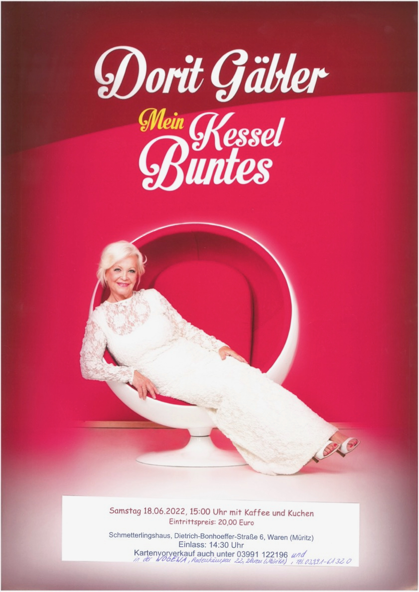 „Mein Kessel Buntes“ heißt es am 18. Juni ab 15 Uhr im Schmetterlingshaus der WOGEWA in Waren-West. Zu Gast ist Dorit Gäbler, die mit ihrem Programm ein BEST OF aus 45 Jahren erfolgreicher Kleinkunst-Tätigkeit präsentiert. Es erklingen die schönsten Liebeslieder aus zehn Unterhaltungsprogrammen von Marlene Dietrich, Hildegard Knef, Dalia Lavi und aus eigener Feder.