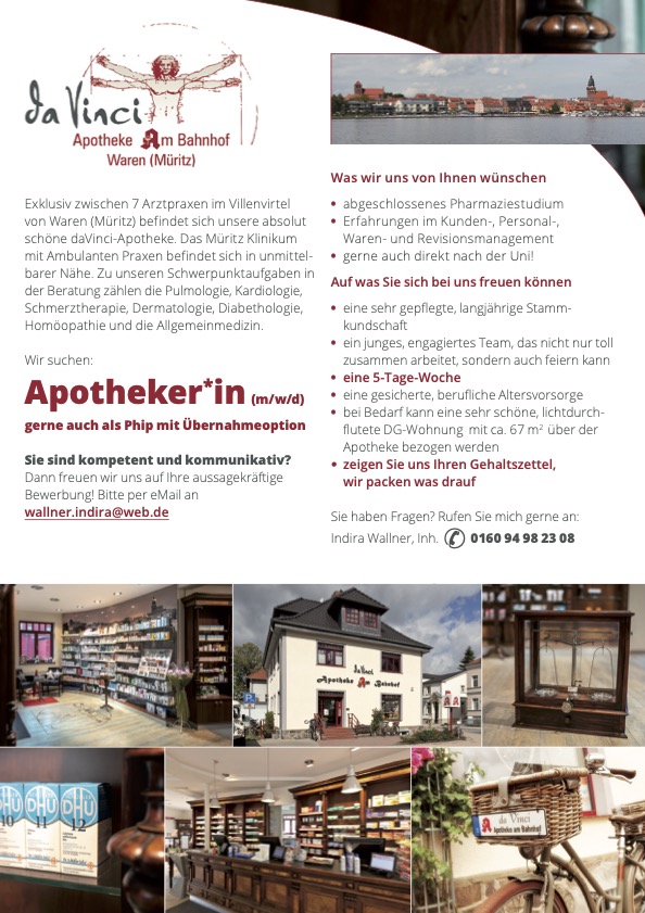 Die Warener Apotheke „da Vinci“ am Bahnhof ist auf der Suche nach einem Apotheker/in: