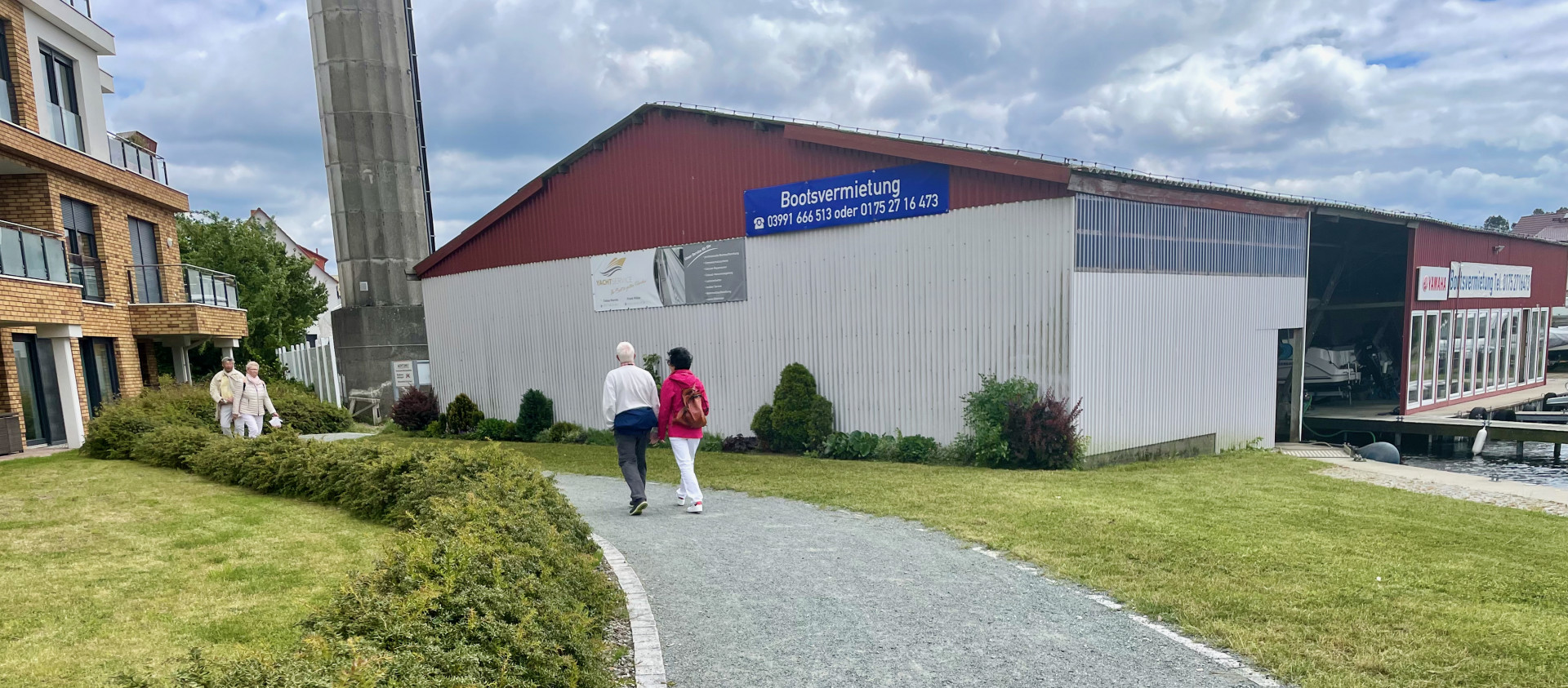 Bis die Stadtverwaltung jetzt mit dem Ausbau eines Teilstückes um die Ecke kam. Denn hinter der Hafenresidenz gibt es ein kleines Stückchen Weg, das am Grundstück der Müritz Marina endet. Dieses Stückchen soll nun weiter geführt werden. Was der Wanderer sieht, wenn er den neuen Weg entlang geht? Jedenfalls keine Müritz, sondern die Hallen der Marina. Weiter soll’s dann später entlang der mehr als 100 Jahren alten Bootsschuppenanlage „Hafen Bleiche“ und dann unterhalb der Grundstücke am Seeufer bis zur Kuhtränke gehen.