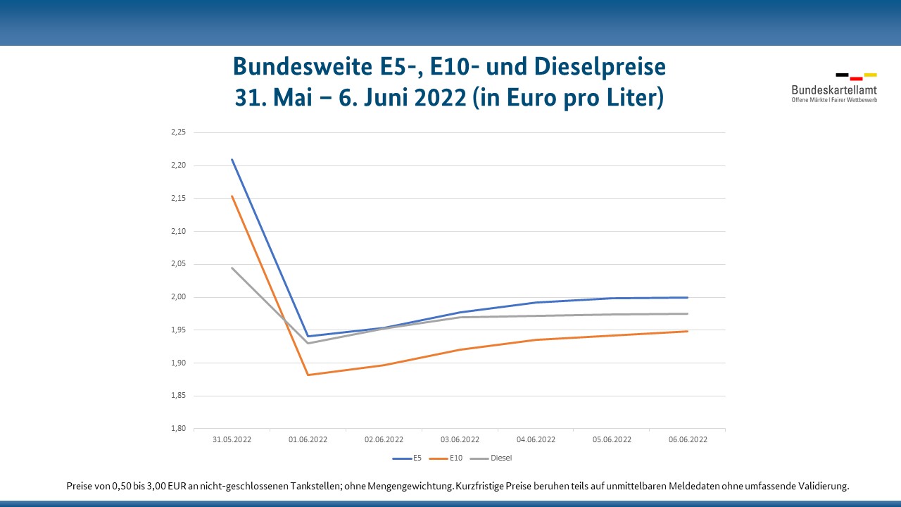 Das Bundeskartellamt beobachtet mit Hilfe der Daten der Markttransparenzstelle für Kraftstoffe kontinuierlich die Preisentwicklung an den rund 15.000 Tankstellen in Deutschland. Die Markttransparenzstelle gibt die von ihr bundesweit erhobenen Kraftstoffpreise an zugelassene Verbraucher-Informationsdienste weiter. Die Informationen können die Autofahrer dann bei einer Vielzahl von Anbietern online und über mobile Apps abrufen. Andreas Mundt, Präsident des Bundeskartellamtes: „Mit der Einführung der Steuerermäßigung ist der Preis für E5 und E10 zunächst um 27 Cent und der Preis für Diesel um 11 Cent im Durchschnitt gefallen. Seitdem sind die Preise wieder leicht, um ca. 5-6 Cent im Durchschnitt angestiegen. Wie das sich zum Verlauf des Ölpreises und anderer Marktindikatoren verhält, werden wir im Laufe dieser Woche auswerten.“