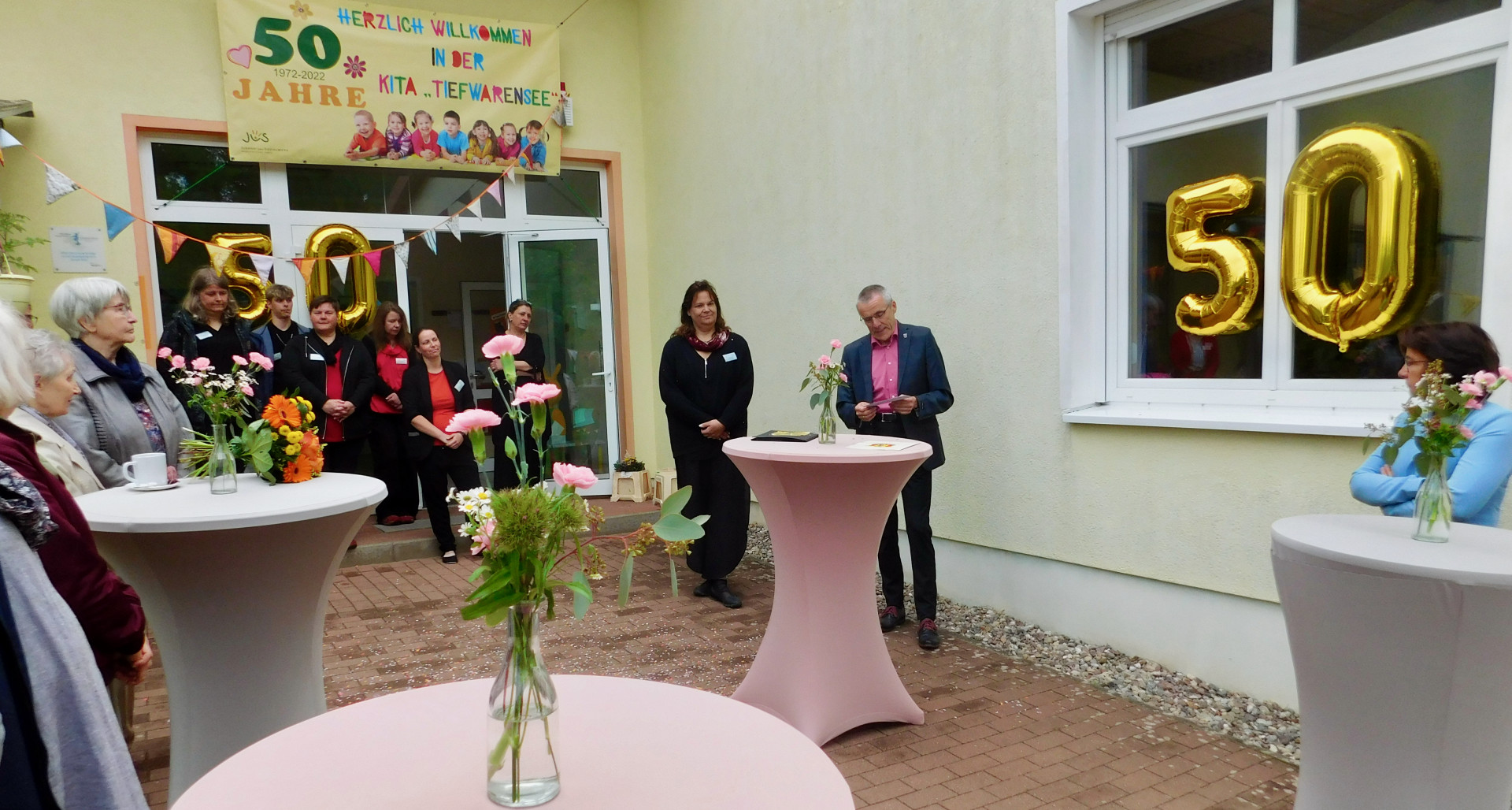 Sie gehören zu den Jüngsten in der Stadt Waren, ihre Kita ist aber schon ein halbes Jahrhundert alt: Die „Kita Tiefwarensee“ hat vor wenigen Tagen ihren 50. Geburtstag gefeiert und es richtig krachen lassen – war ja schließlich ein „Runder“. Mit dabei viele Ehrengäste – auch Warens Bürgermeister Norbert Möller – Eltern, Großeltern sowie ehemalige Kinder und Mitarbeiter.