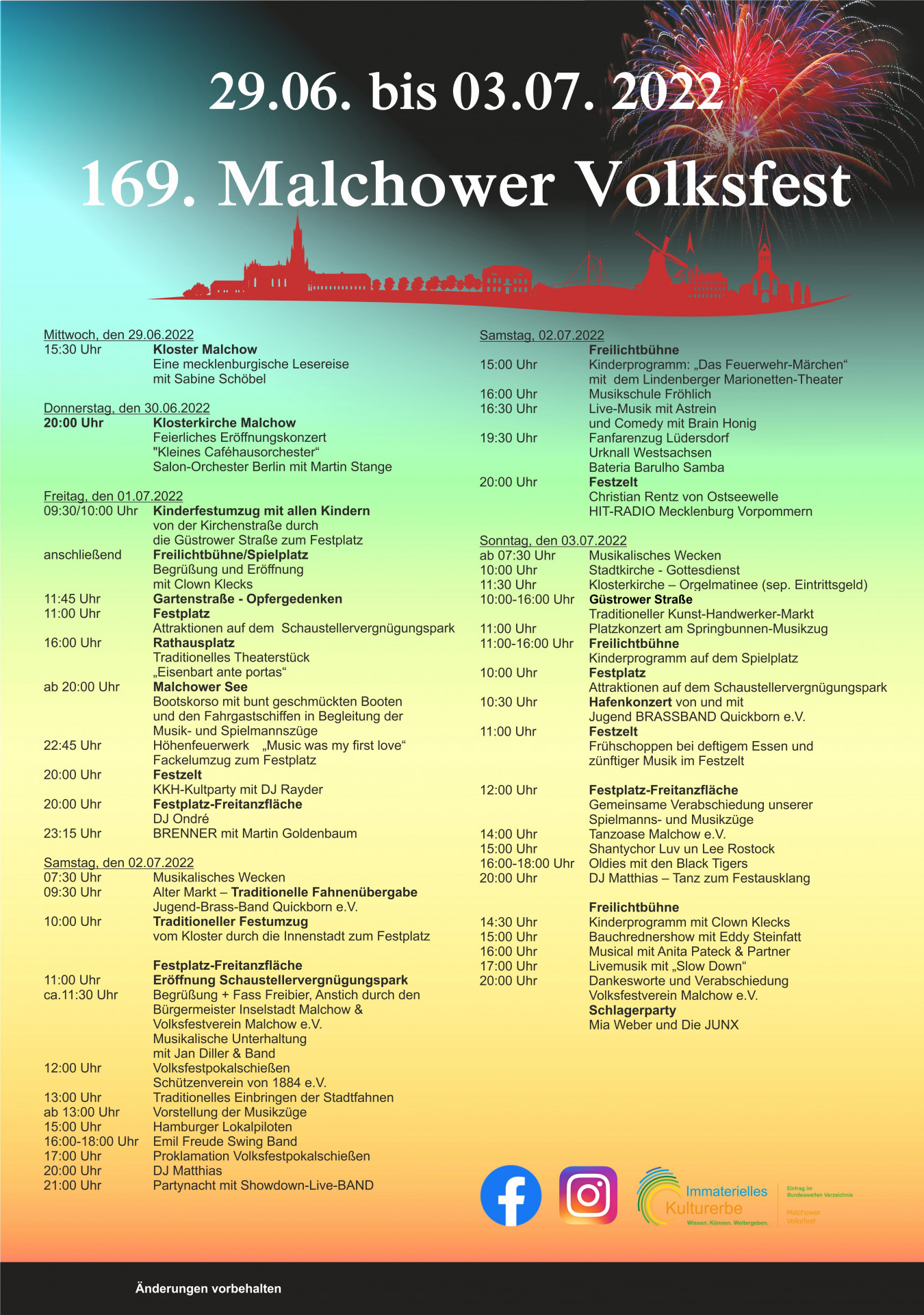 Ab dem 29. Juni erlebt die Inselstadt Malchow wieder ihre fünfte Jahreszeit. Das erste Mal seit 2019. Obwohl die 167. und 168. Malchower Volksfeste als einziges Stadtfest in der Region nicht komplett ausgefallen sind, da die Malchower viele Punkte trotzdem gefeiert haben, ist der als Volksfestverein sehr stolz, nun wieder ein „komplettes Fest“ planen und durchführen zu können. Zu den Highlights gehören neben dem traditionellen Kinderumzug am Freitagvormittag, Feuerwerk und Bootskorso am Freitagabend und dem großen Festumzug am Samstagvormittag dieses Jahr der Auftritt der Berliner Rockschlager Band „Brenner“ am Freitagabend auf der Freitanzfläche.